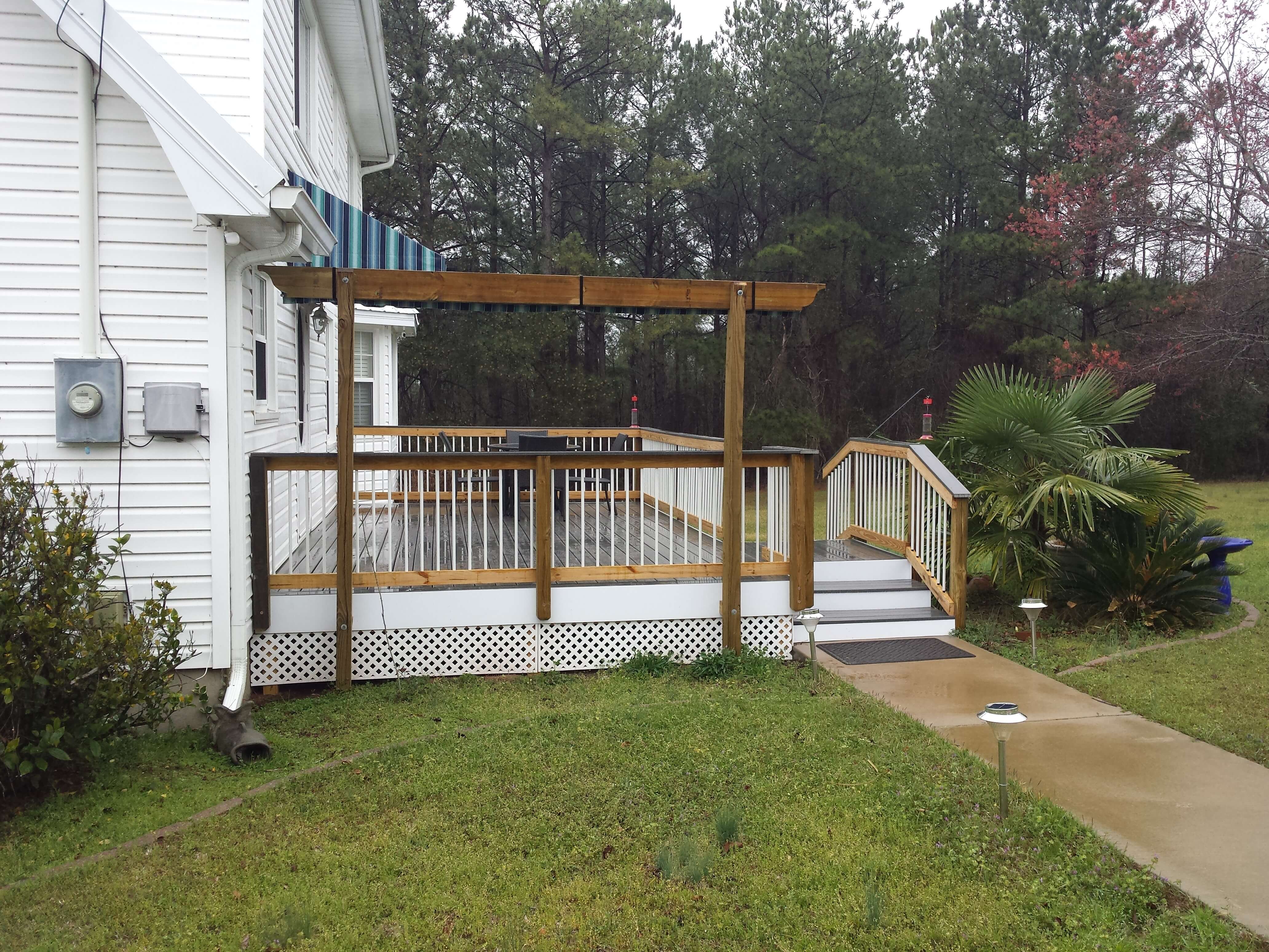 In addition to replacement of the decking boards with the new Fiberon product, Archadeck of Central GA also installed a new white PVC edge band, new railing with white Deckorators pickets and rebuilt the privacy trellis/screen area.