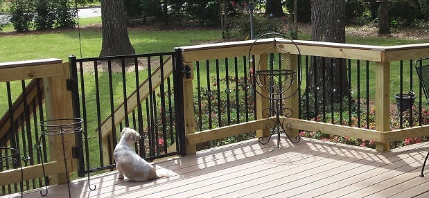 In addition to the new composite decking, we also added a beautiful new railing system created with Fortress Iron pickets and a TimberTech rail cap. To quell the desire for the homeowner’s beloved dogs to enjoy the deck, we added custom Fortress iron gates to the space. This means the entire family can now enjoy the backyard in safety and serenity!