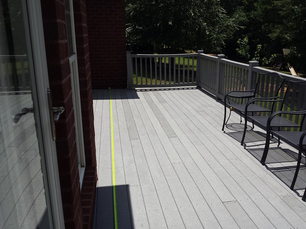 When the homeowners originally purchased the home in the early 2000’s, they had a deck installed when they moved in. They decided they wanted a low-maintenance deck so they chose to have their new deck built with Trex composite decking. After some time had passed, they noticed that the exterior of the decking boards had begun to mildew. The mildew was an issue that arose from the incorrect spacing and gapping of the decking boards during the initial installation of the deck. The boards were installed with little to no space between them which caused them to mildew. Thus, the homeowner had to use bleach in order to remove the mildew which then compromised the integrity of the boards themselves. Once the bleach began to break down the components of the decking boards, they began to flake and degrade. The use of bleach also degraded the deck railing and skirting as well.