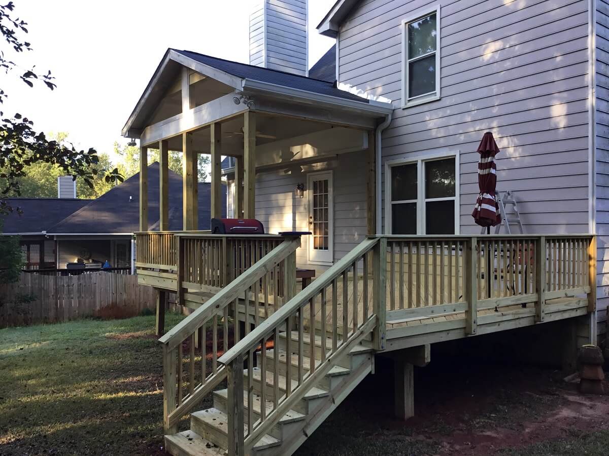 Macon-area porch builder and deck builder Archadeck of Central GA went right to work on a new porch and deck. The homeowners chose an open porch design rather than a screened porch this time. We were able to save the porch roof, from the beam up, but we did have to replace the porch walls and the floor. We added a new beam and two new posts, along with joists and a new edge band. We also installed new gutters.