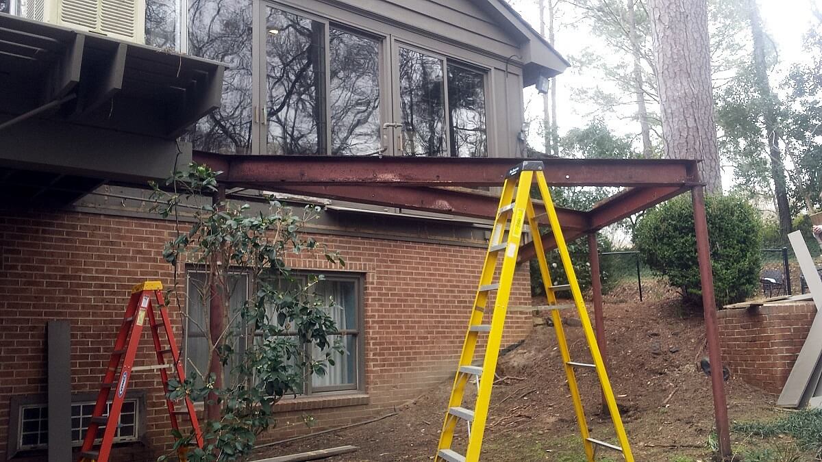 The Architect that originally designed this home and deck, added a strong steel beam supporting structure. Though it outlived the wooden deck, it was in need of improvements. After evaluating the state of the steel structure, we found that it would be costlier to refurbish it than tear it down, and so we did. We cut the steel into manageable pieces with a torch, and carried it away for disposal. We then replaced it with a sturdy wood support structure.