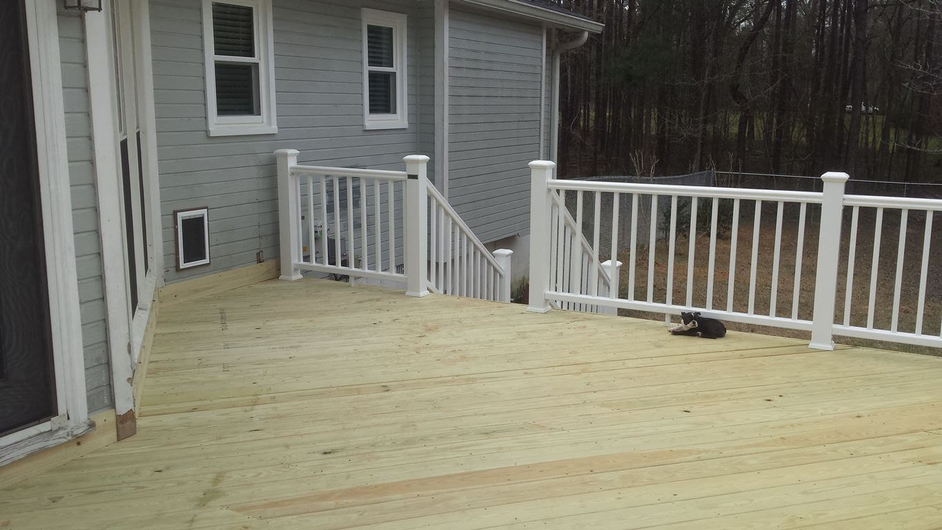 Once the structural amendments and repairs were made, we set to work building their new and larger deck. The deck was built from pressure-treated pine and features a low-maintenance Fiberon rail in white. The larger footprint boasts plenty of room for outdoor furniture and accessories.