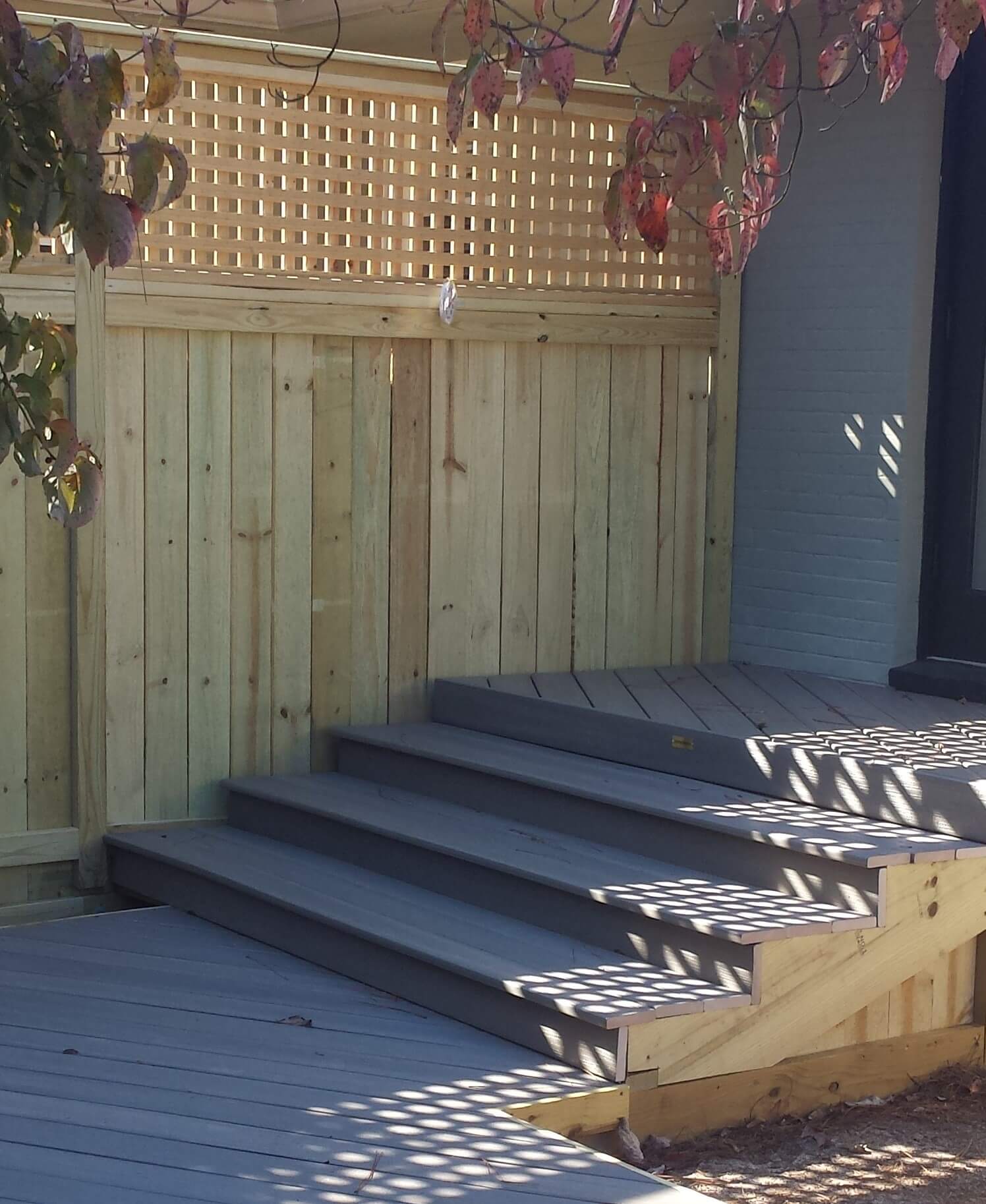 These clients wanted to keep the same footprint for their expansive private deck. But for one small area, where there were three steps before, which we replaced with a new wood privacy wall, the deck maintains its original shape. The existing deck was difficult to use due to its wood construction, built so close to the ground. It was built similar to a pallet, sat atop the ground, which made it uneven. Archadeck of Central GA replaced the wood decking boards with PVC decking by Fiberon.