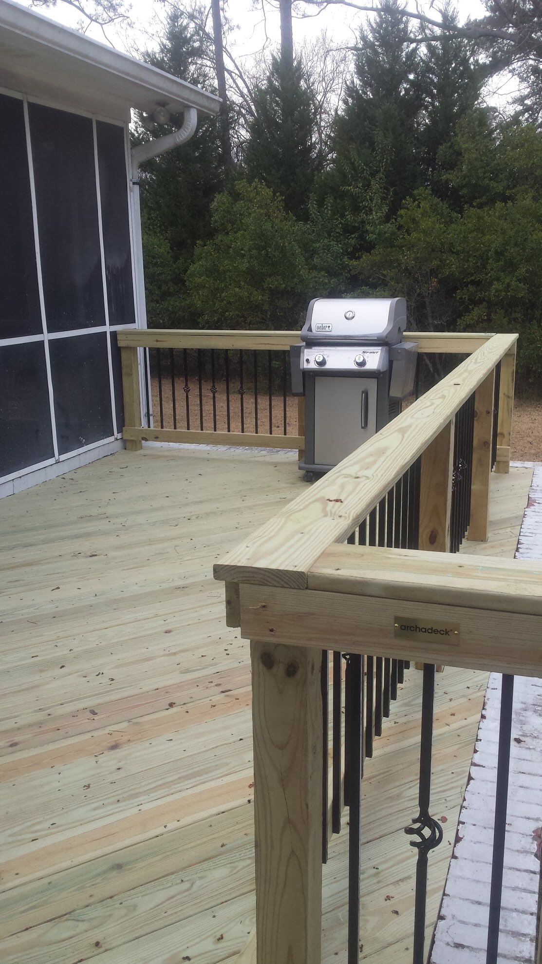 This new deck is literally inset into the brick surround, supported by the existing footing. The diagonal wood inlay is truly a unique take on a new deck for a vintage space! This deck attaches to the home’s existing screened porch, essentially doubling their use of their outdoor space. This 10’ x 21.5’ deck is large enough for entertaining or relaxing and gave these homeowners a new and improved spot to grill.