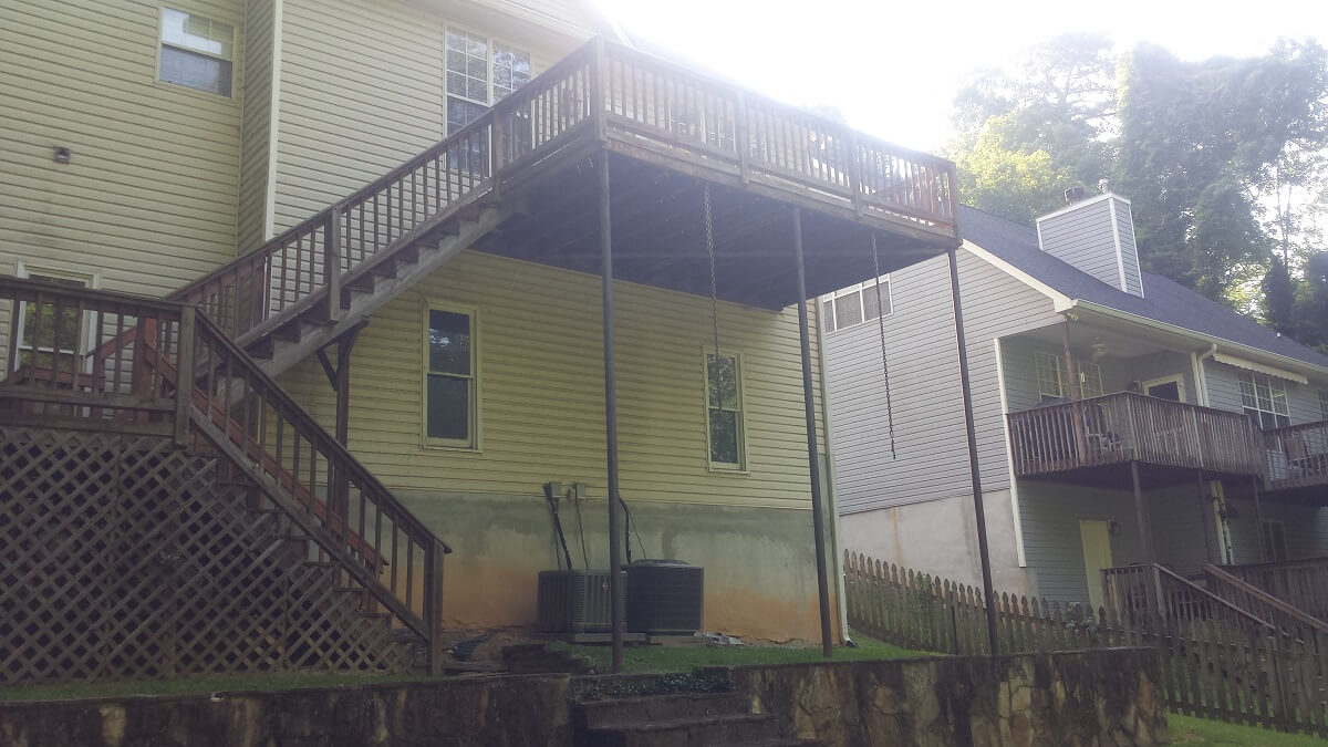 Since the structural components of this Macon deck were in great shape, we were able to save the joists and post supports. These homeowners chose to re-deck with Fiberon Good Life decking in Bungalow, a multi-tonal wood-look finish. We replaced the entire deck stair, moving it slightly from its original position. The stair and deck railing were created using a pressure-treated wood frame and pickets, with a Fiberon decking top rail to match the decking and prevent splintering on the handrail.