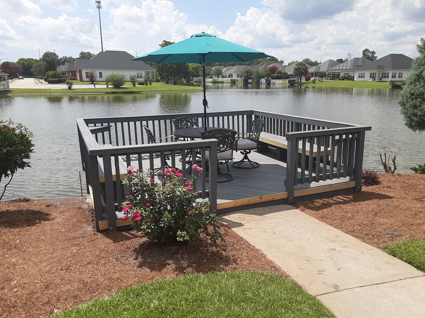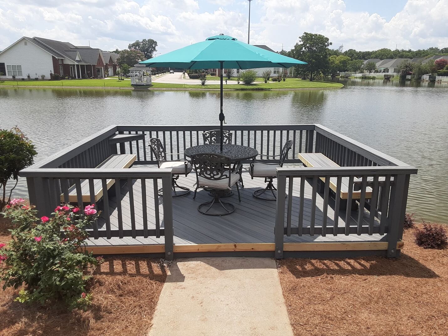 Archadeck of Central GA used beautiful Fiberon Good Life composite decking in the color Escapes Beach House for the upgrade. Not only will this decking resist splintering, cracking and decay, it also easy to clean. The three-sided capped construction also resists staining and fading, making it perfect for waterfront designs. In addition to the new composite decking, we also redid the bench seating on the dock and upgraded the wood railing to match and added a matching Fiberon cap.