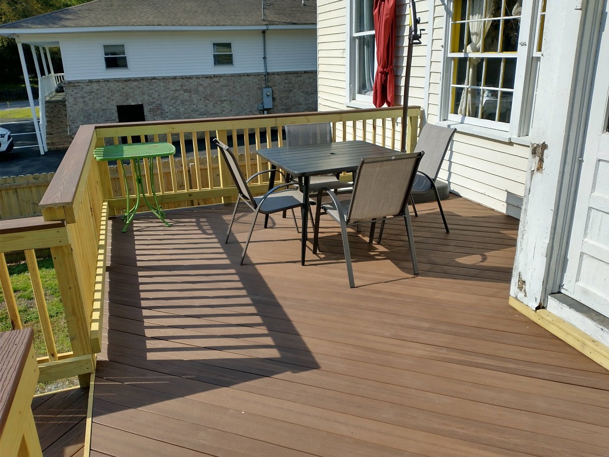 The new deck was built using pressure treated lumber framing with low maintenance Fiberon Good Life decking in the color Bungalow. Fiberon decking offers an authentic wood look and distinct grain patterns resembling exotic hardwoods.
