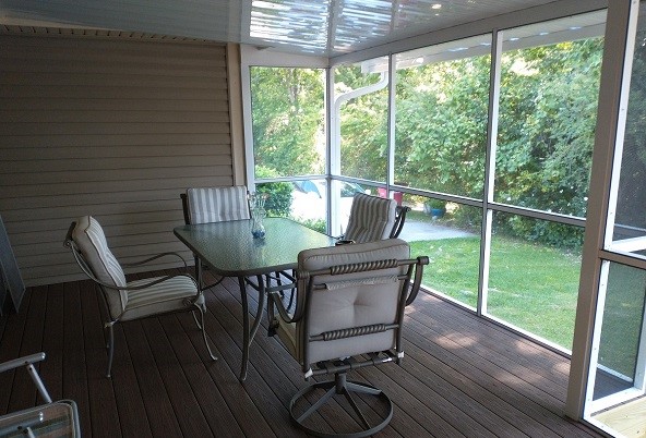 When our design team first arrived for the homeowners complimentary design consultation, we found a small deck outside of the living room. So our first order of business was to get that deck up-to-par. We added elements to the existing deck substructure to make it stronger, and upgraded the decking to low maintenance. Additionally, we also built a large deck on the right. And to make the space functional and practical as it could be, we built screened walls turning the space into a screened porch.