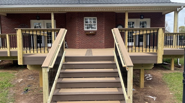 The heart of this well-built and expertly designed deck transformation lies in the choice of materials. The use of low-maintenance AZEK TimberTech decking in the rich colors of Coconut Husk and Dark Cocoa not only enhances the visual appeal but also ensures durability and longevity. These Byron GA homeowners can now enjoy a beautiful deck without the constant upkeep typically associated with traditional wood decks.