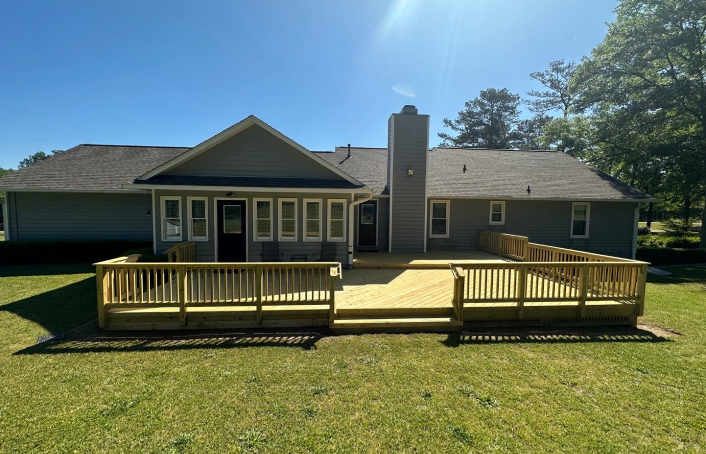Keeping the spatial parameters of the deck that was previously in their South Macon backyard, our deck replacement experts created a brand new outdoor living deck retreat for this family using pressure treated lumber, ensuring its safety and durability, crowning it with a grab for the staircase to ensure safe access and exit into the rear landscape.