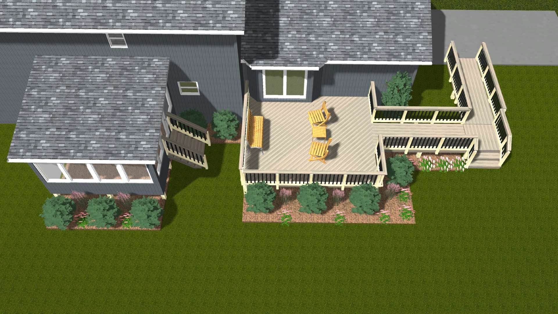 Our initial 3D design captured everything our client wanted—a seamless connection between her indoor and outdoor spaces with multiple access points. The plan included stairs from the existing screened porch, new sliding doors that would transform her bay window area into a direct deck entrance, and a ramp connecting the deck to her driveway.