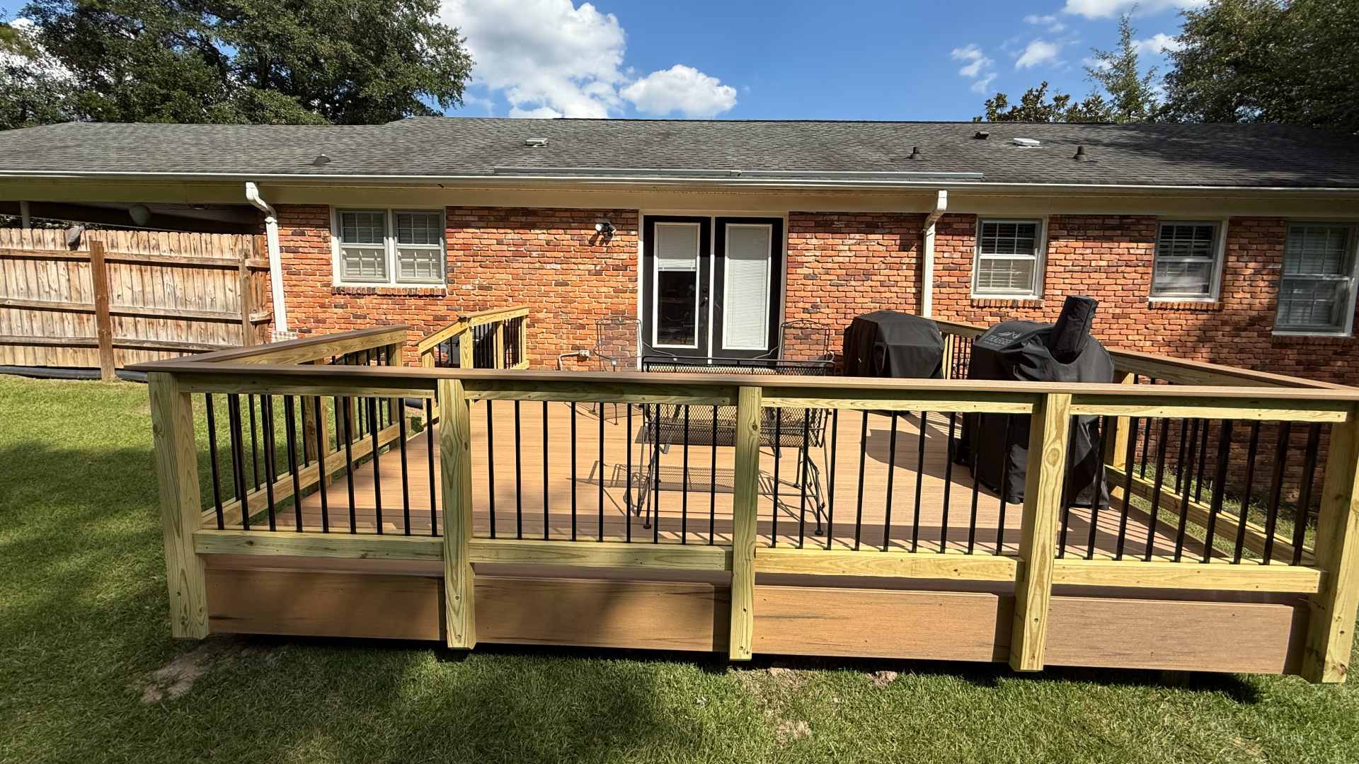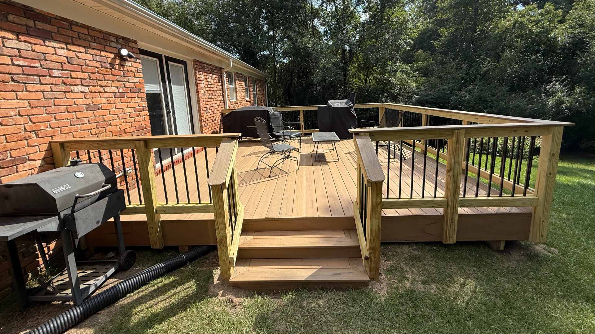 The brief was straightforward: build a deck that could handle Georgia weather and be a comfortable outdoor living space for years to come. What this Bibb County homeowner got was exactly that—a well-proportioned deck that looks like a natural fit with their brick ranch home while still showing the kind of craftsmanship that separates professional work from quick fixes.