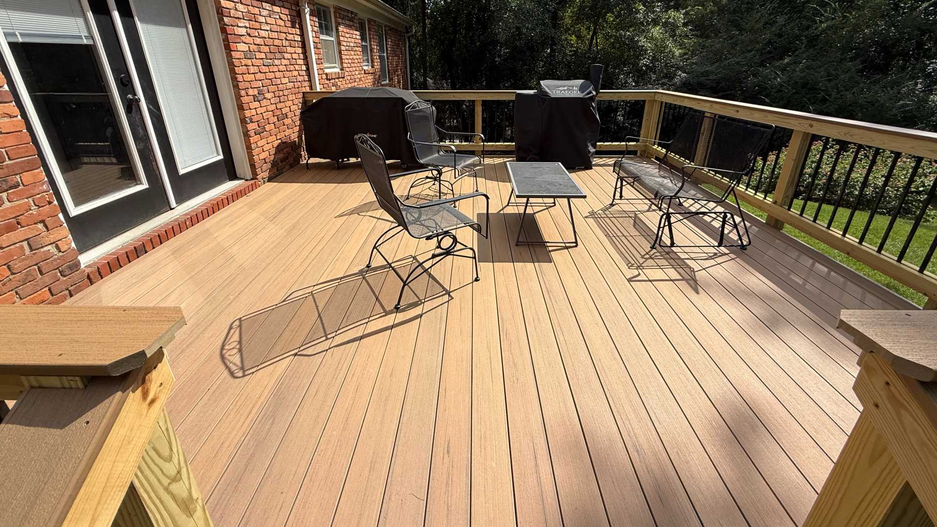 For this project, we selected TimberTech Prime+ composite decking in Coconut Husk—a warm, neutral tone that complements the home's brick exterior beautifully. It’s close to the natural color of wood, but provides the benefits of composite decking.