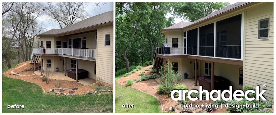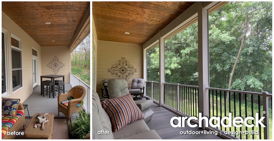 As open porches started being integrated into new construction homes over the years, we find that many of those homeowners ultimately wish their porches were screened in. So much of the increased interest in screen porches we are seeing is from folks who have an open porch and would like to convert it into a screened-in porch. Here are some before-and-after views of such a tailor-made (note: not all are so tailor-made) conversion project we recently completed southeast of Des Moines near Yellow Banks Park outside of Pleasant Hill.