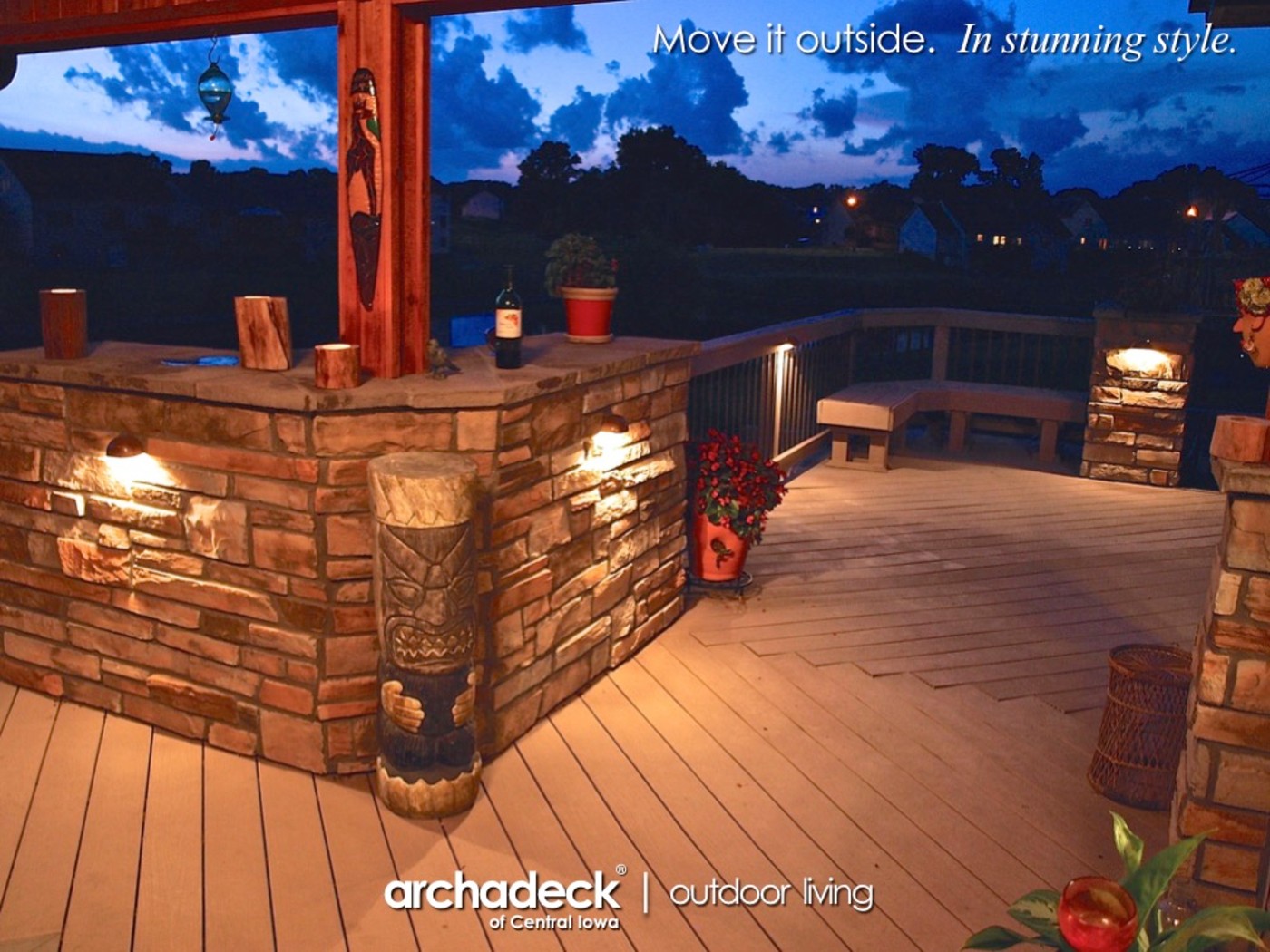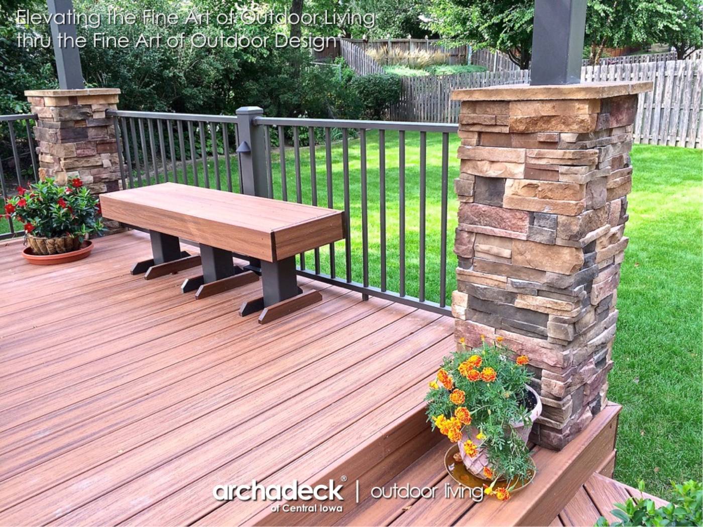 Des Moines patio companies and deck builders will often incorporate stone in deck columns, porch pillars, pergola supports, fireplaces, TV walls, outdoor kitchens, retaining walls, patio seat walls, and fire pits. Just about any vertical element benefits from stone's substantial presence.