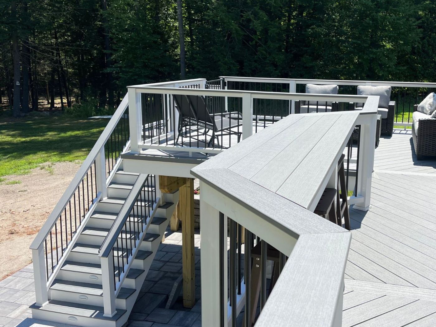 For decks, picture-frame borders can match your primary decking color or use complementary tones. When choosing contrasting colors, the deck fascia trim typically matches the border color, which gives the appearance of cohesive visual flow. Stair treads also follow the same color scheme, which keeps the coloring consistent throughout the structure.