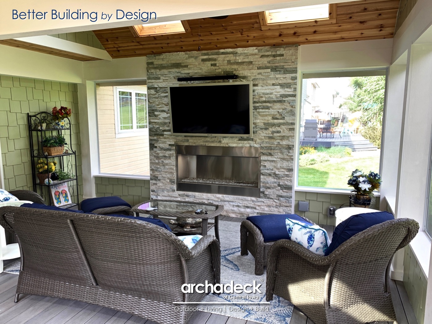 A lot of homeowners start to get cabin fever in the winter in central Iowa. That’s why homeowners are increasingly wanting outdoor living areas such as patios with firepits and screened in porches with electric heaters that they can use 10 to 12 months a year. Multi-season outdoor living design can elevate both the value and usability of your home, transforming outdoor spaces from seasonal luxuries into year-round retreats.