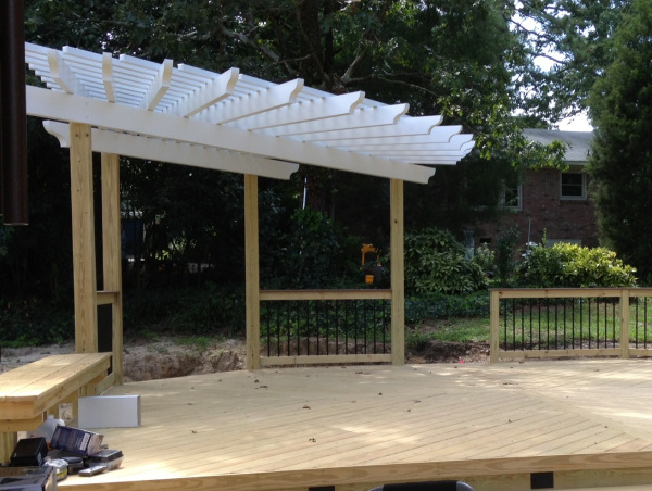 Details of a custom aluminum pergola that graces this wooden deck in West Columbia, SC.