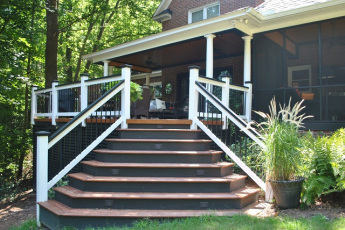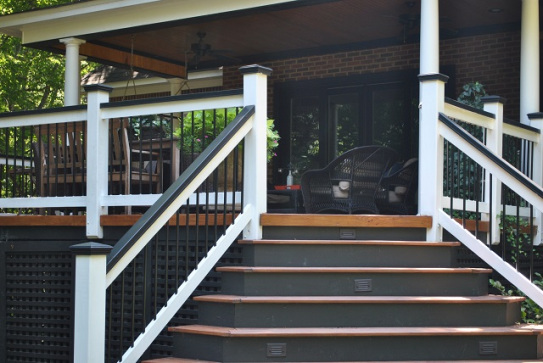 The homeowners’ flair for design also shone through in this project; the black and white details add to the elegance of the entire space. Adorned with majestic columns and a sweeping staircase, this deck and porch combination makes a bold statement adding to the beauty of this already stunning home!