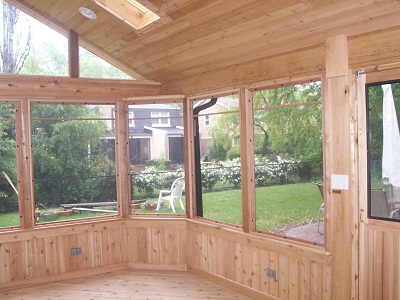 — Open (exposed) rafter screened porch ceiling with natural wood