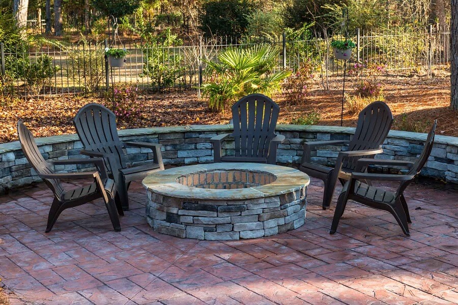 A great alternative to a paver patio is a stain and stamp concrete patio. At a more economical price than pavers, this stained concrete allows room in your budget for other elements. Take a look at the way we combined a stain and stamp patio with a stone retaining wall and custom fire pit on this project in NE Columbia: