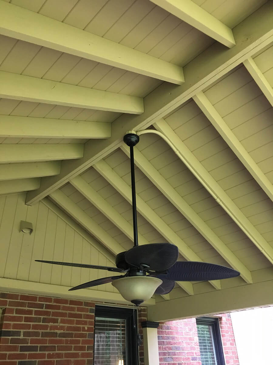 The deck covering consists of a gable roof adding shade and protection from the elements. The interior of the porch cover features a charming exposed-rafter ceiling and a ceiling fan for added comfort on those warm central SC days.
