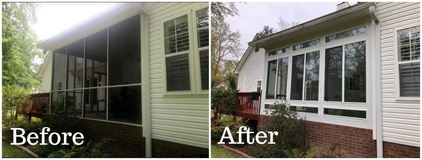 Archadeck of Central SC was able to convert their existing screened porch/patio into a custom sunroom using an infill system with low-maintenance aluminum. This type of conversion is less invasive than a traditional sunroom build. This means we were able to convert the porch into a stunning sunroom using much of the existing substructure and in less time than starting from scratch.