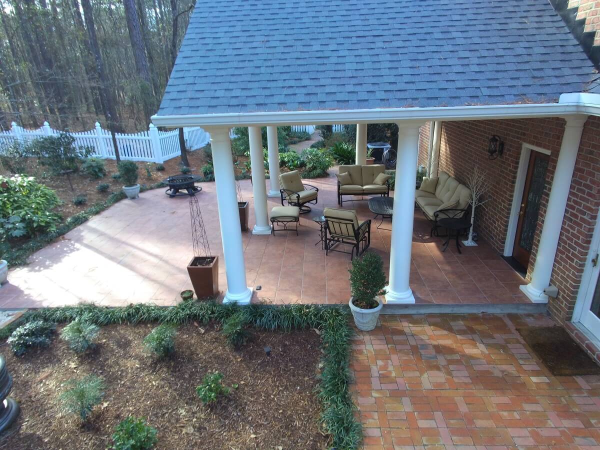 The homeowners have lived in this home for the last 23 years and they love every aspect of their home. However, they have a heavily-wooded lot that makes it difficult to grow lush turf. With this in mind, they decided to turn all of their back yard into one large outdoor living space. They hired a landscape designer and had all the grass removed and installed gravel walkways and shrubbery beds instead. The back yard now flourishes with evergreens that add vibrancy to the yard for year-round interest. An added benefit to this transformation is that the entire yard is also super low-maintenance with no mowing required. The new porch cover we added for them is the finishing touch to the look and feel they had in mind.