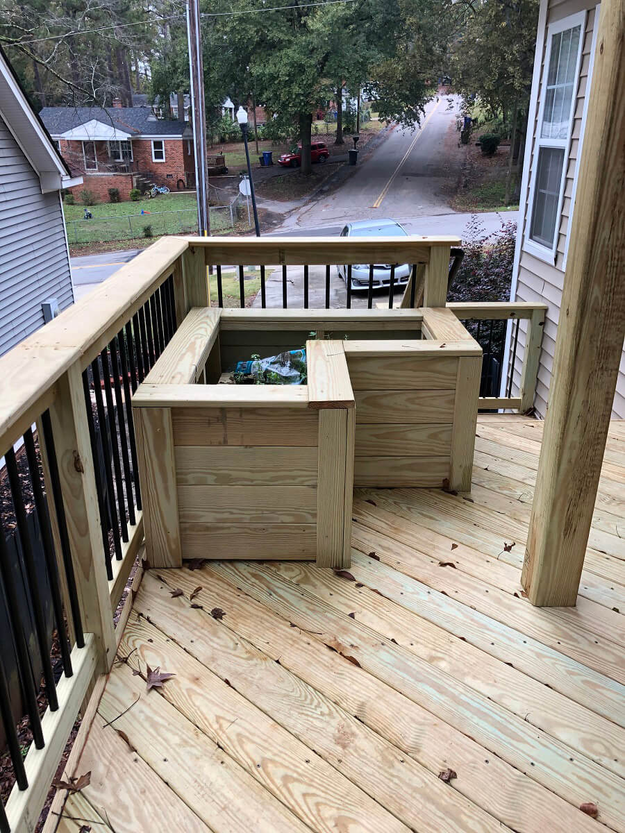 — Custom L-shaped porch planter box by Archadeck of Central SC.