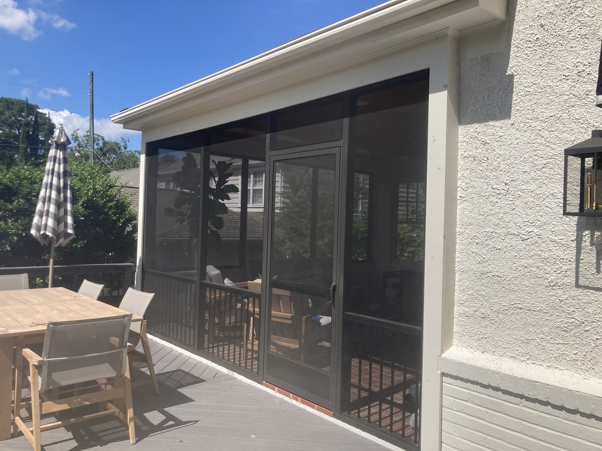 First, we extended the screened porch to a roomy 16 x 15 footprint. This provides more area for seating, dining and overall outdoor living enjoyment. In addition to the space upgrade, we also updated the existing screened porch to an aluminum screened porch to give it a fresh look and feel.
