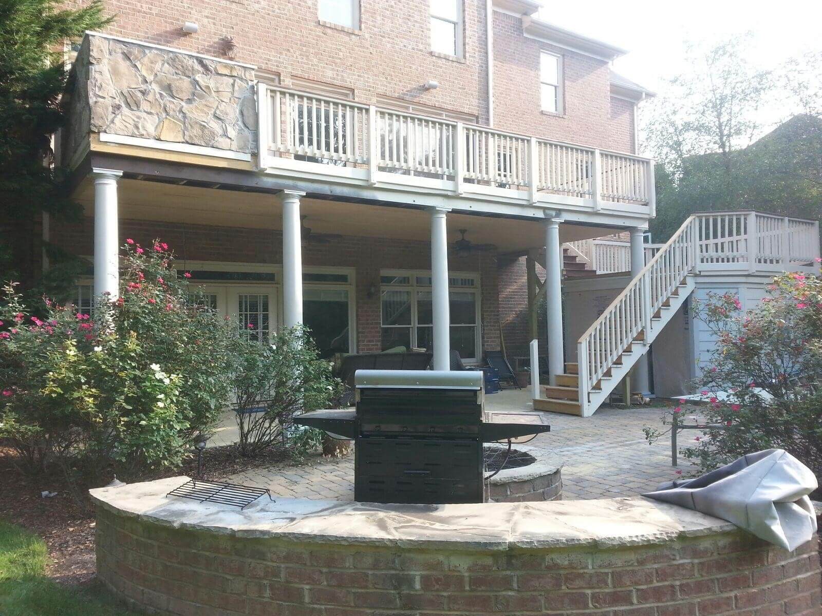 A common misconception is that once you put down plywood, a mortar bed, and your stone, that this will keep the space below the raised stone deck dry? This is a where we find the problem. A key step is left out of the process here. In this construction, a rubber membrane needs to be installed directly over the plywood by a trained professional and make sure the edges are turned up. The floor joists need to be designed at an angle so the water drains towards the edge and does not sit and stay on the membrane. Finally, a gutter should be installed on the band of the deck to ensure the water is routed appropriately away!