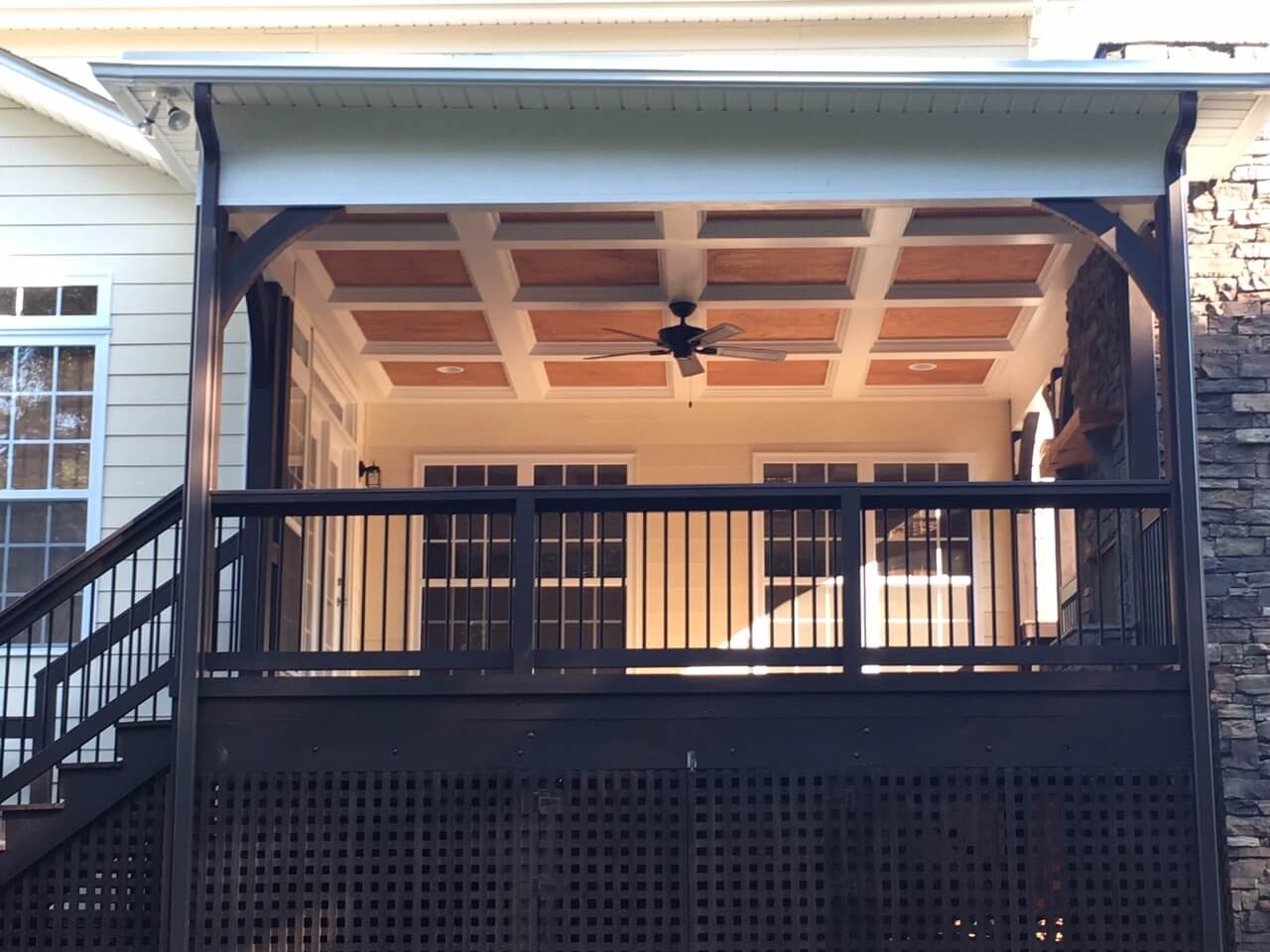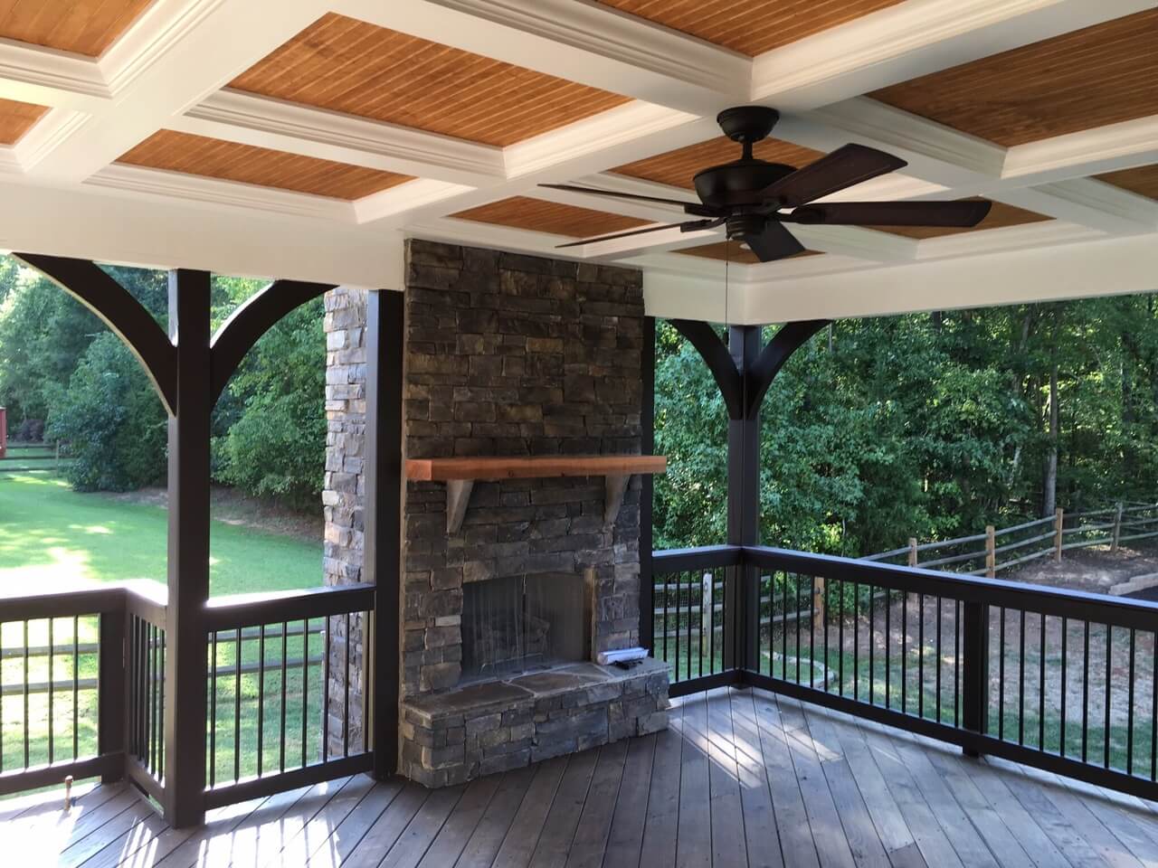 This project consists of an elevated covered porch with a stacked stone outdoor fireplace. As you can see from the images, this project is loaded with details. From the intricate “coffered” beam ceiling on the interior, to the curved posts and custom colored guttering, this project elaborates in every detail.