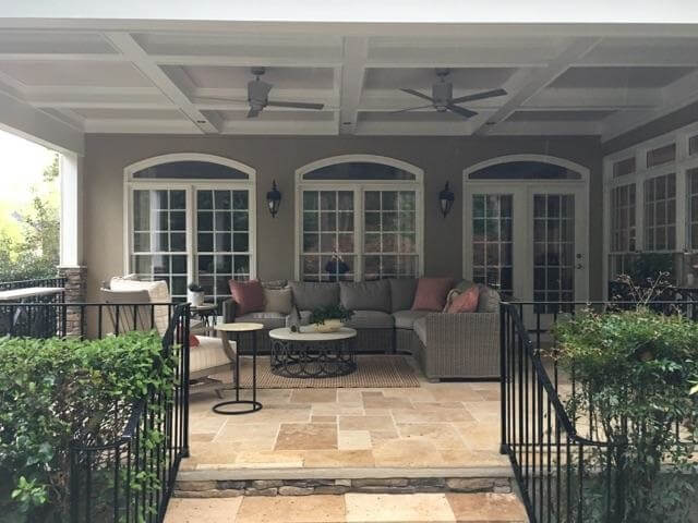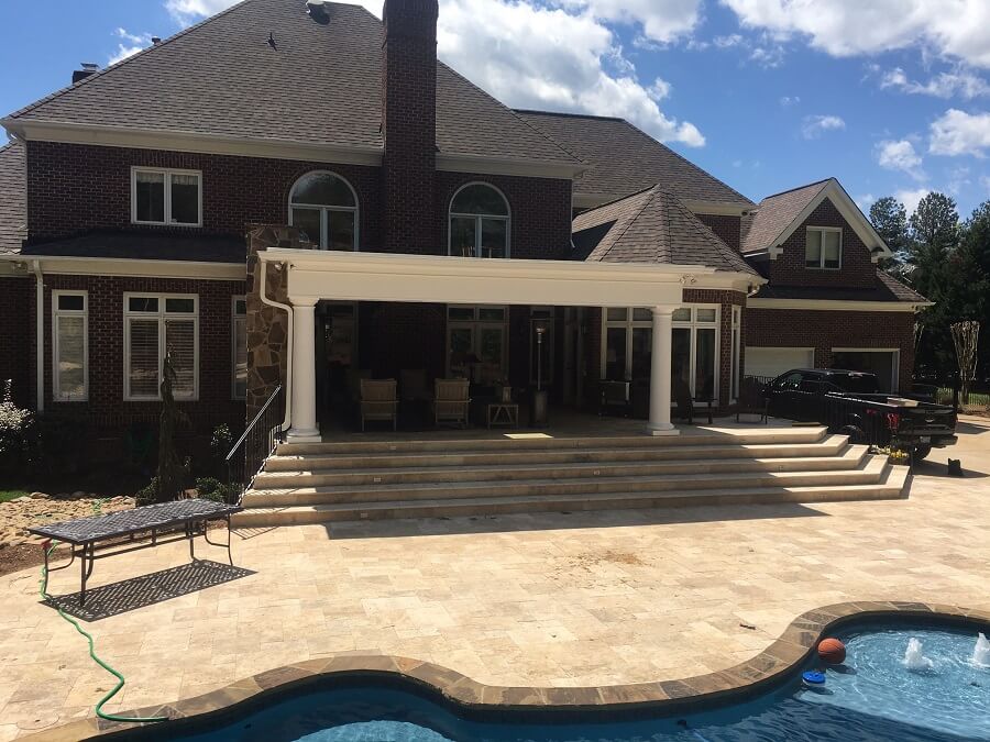 Travertine patios are very popular among Charlotte homeowners. Travertine tile delivers a very neat and organized look. One of the best advantages of using it on the floor of your patio is that it stays cool underfoot even in hot conditions. It comes in a variety of colors and subtle textures to suit any taste. Travertine is also absent of efflorescence. Efflorescence is the white deposit that sometimes occurs on the surface of concrete and some paver projects just after completion.