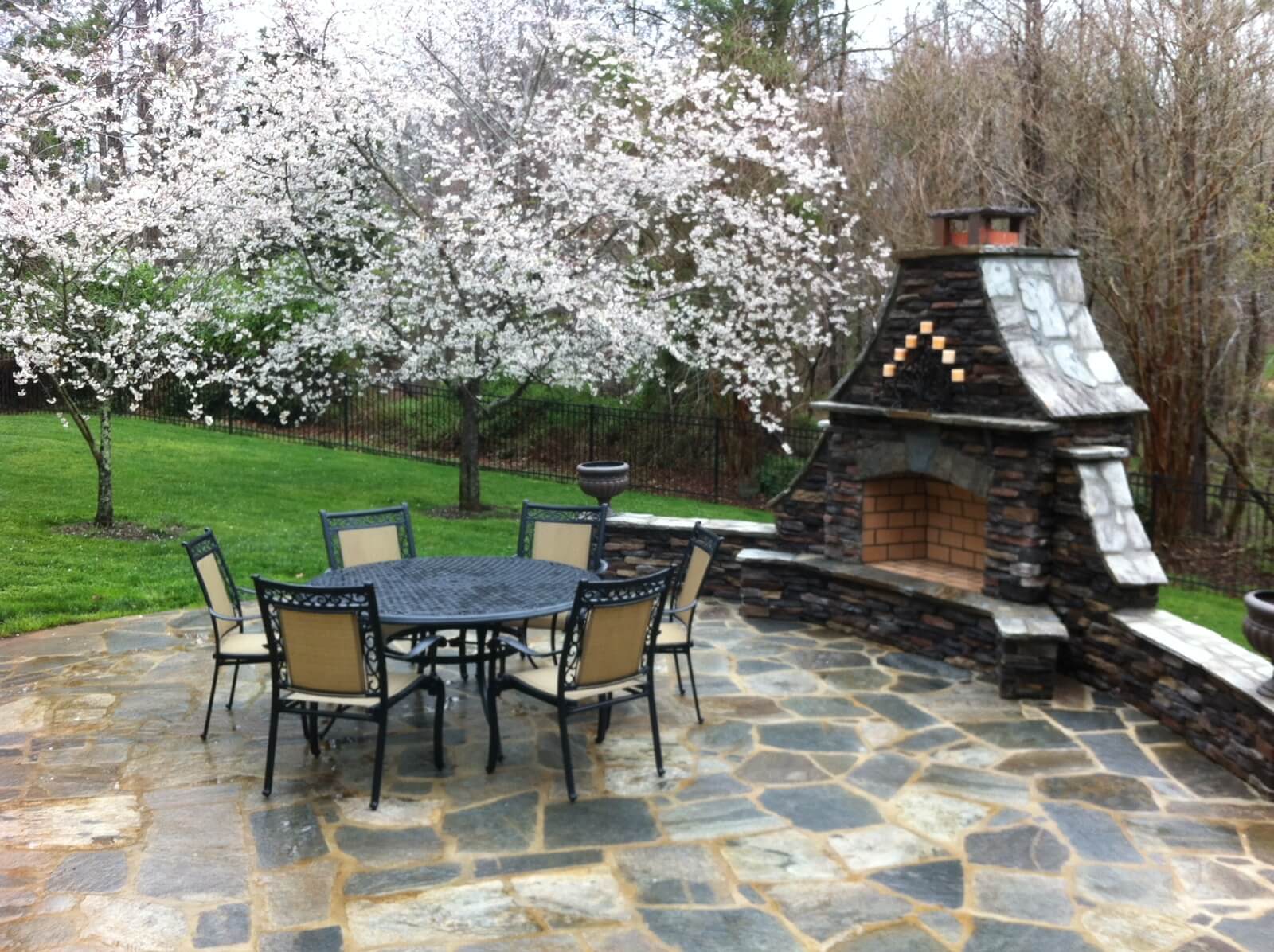 Take a deep breath. You know this time of year. The pear trees are just starting to bud and the smell of fresh blooms is alive in the air. Enjoy some of the details of this fantastic flagstone patio and outdoor fireplace. What a showpiece! The outdoor fireplace not only has fabulous design details but is also tremendously functional. The long retaining walls that fan out from the fireplace double as overflow seating. The same can be said of the large stack stone hearth. This artisan-built outdoor fireplace has a brick firebox. There are no inserts or pre-fabricated pieces in this outdoor fireplace.