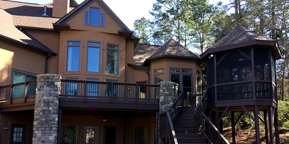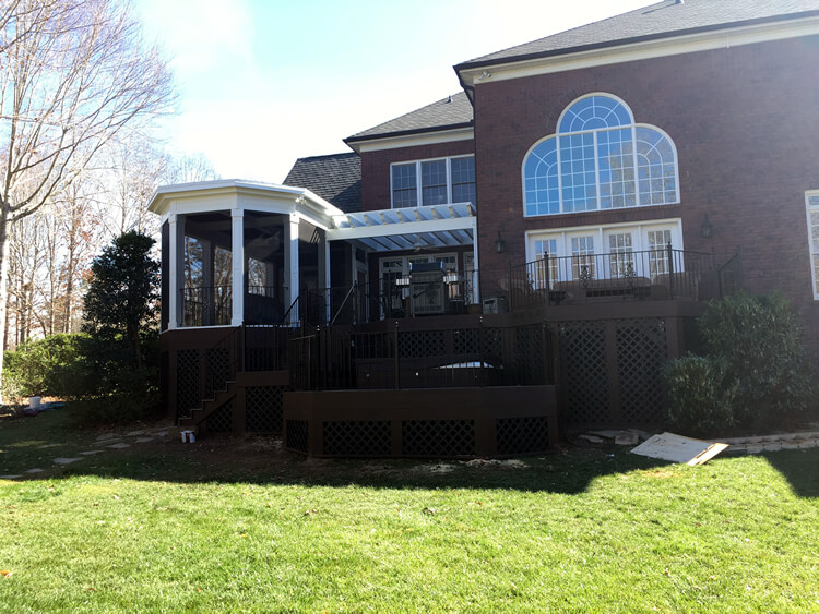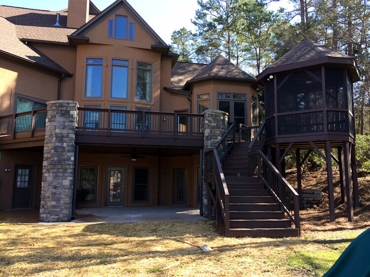 This grand home in Firethorne, with its distinct rooflines and rich color palette became the perfect canvas for a truly unique low-maintenance deck and screened porch gazebo masterpiece. The new deck and screened porch appear very organic extensions of the home with new materials that are in perfect harmony with the home’s original finishes. The substantial stone columns and turret style gazebo make this outdoor living area a real show stopper. The second-story deck and porch inherently provide an additional living area underneath – a walk-out covered patio that could be used as an exclusive overnight guest space, or in addition to the main outdoor living area for large get-togethers.
