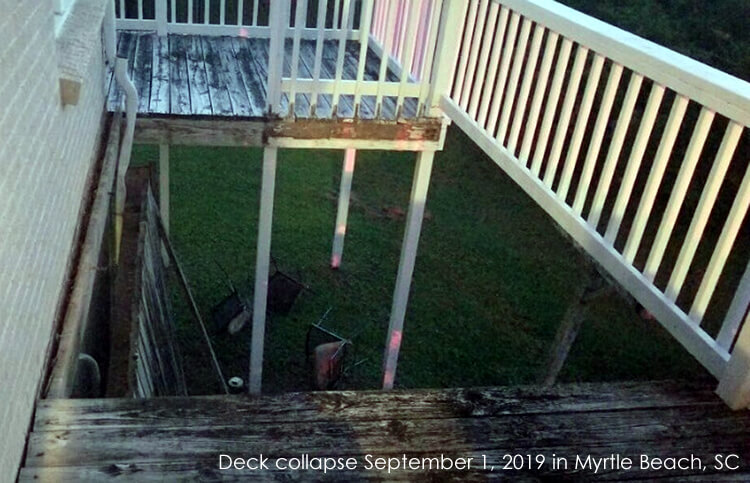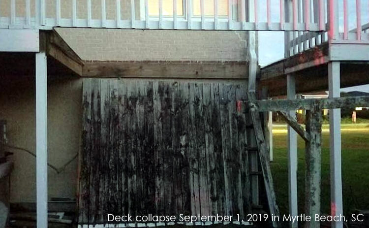 Late yesterday, local news outlets began to report about a deck collapse in Myrtle Beach, South Carolina. This wood deck was holding 12 people when it failed, and a portion crashed to the ground. Three of those people were taken to the hospital with non-life-threatening injuries, but we have all heard reports of failures with much more dire consequences – even fatalities.