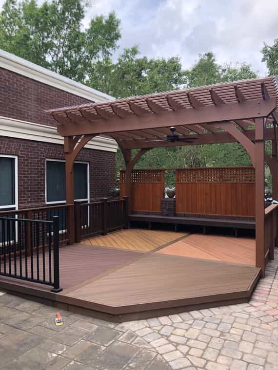 With our outdoor showroom, you’ll be able to see and feel the difference that Eze Breeze windows make in our sample Eze Breeze outdoor room, and also experience the shade and beauty provided by one of our custom decks with a pergola and privacy fence.