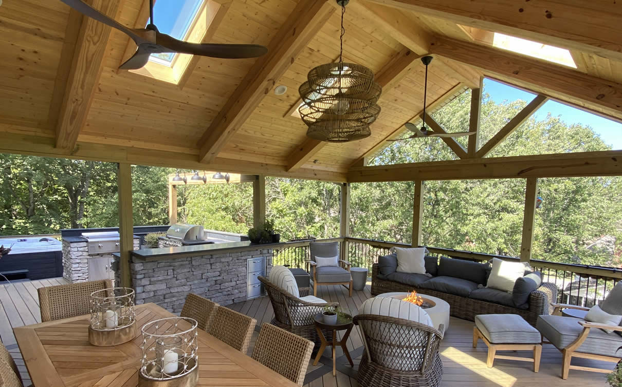 If you're thinking that your new porch design must have screens and windows to be beautiful and functional, think again! Many of our clients love the open-air feel of an open porch, which offers free breezes without walls, but weather protection under a custom roof. If you're considering a new porch and are undecided whether you wish for screens and EZE-Breeze windows, or an open-air design, Archadeck of Charlotte's Lake Norman porch designers are here to guide you to your perfect porch design. Our open porches might not have screens, but they are chock full of beautiful and functional amenities.
