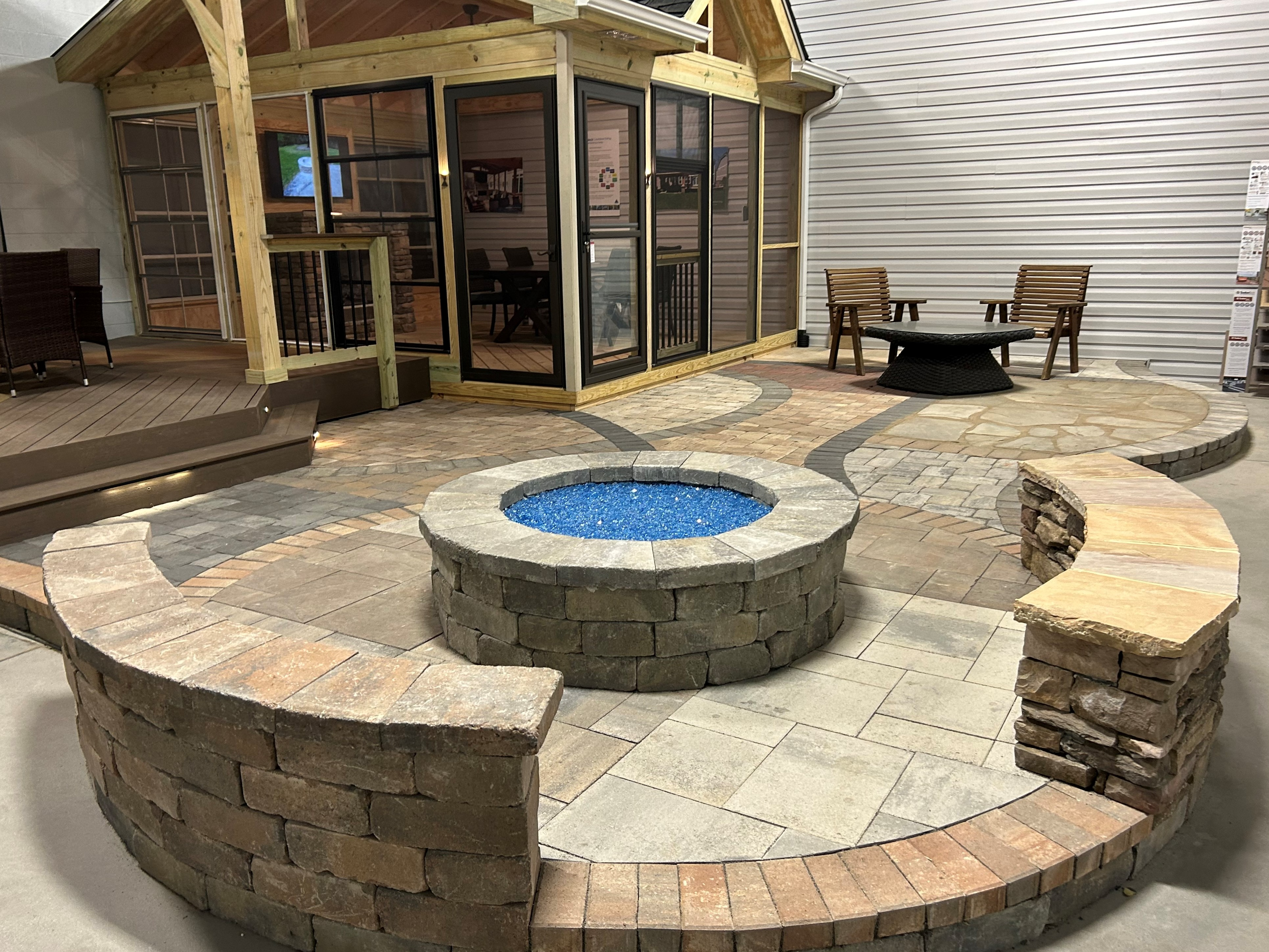 Our patio display features different masonry walls commonly known as retaining walls or seat walls. Adding a wall to your patio creates height & dimension as well as extra seating space. Another popular patio enhancement is a fire feature. Our patio display includes a fire pit with glass beads.