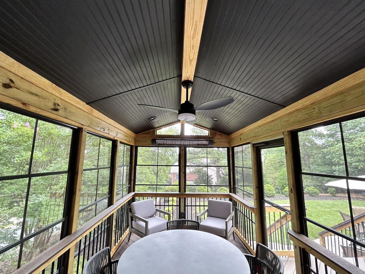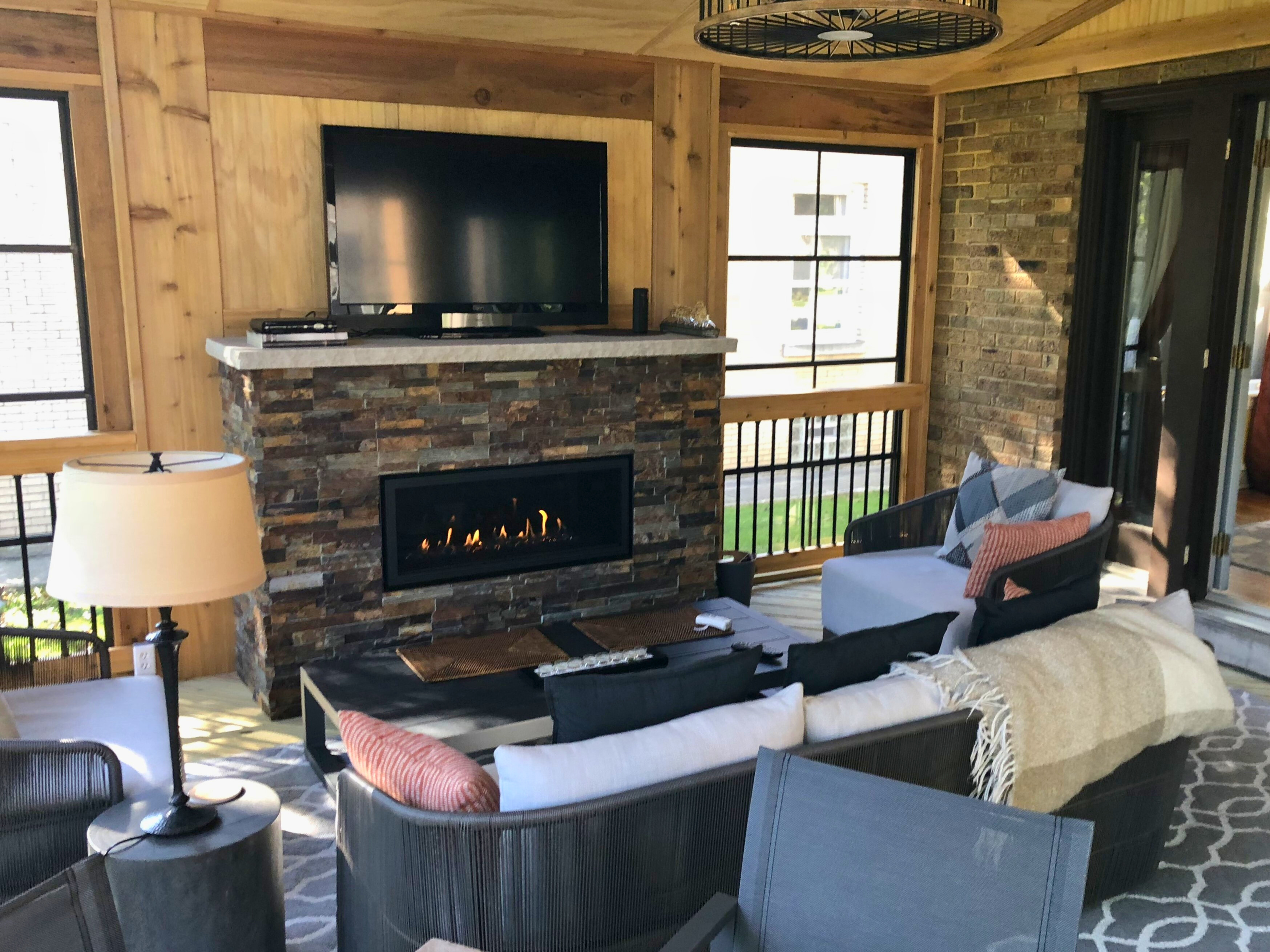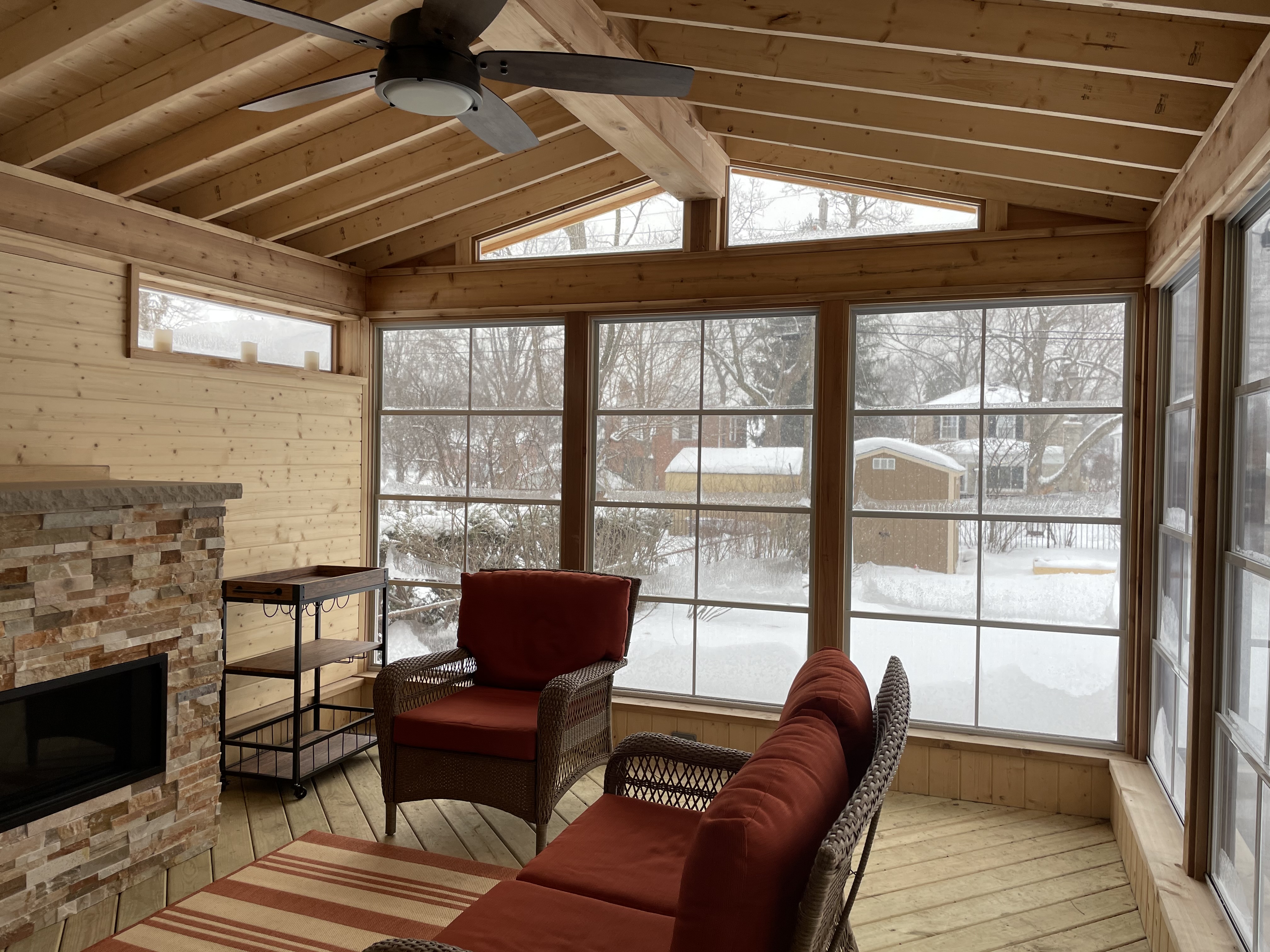 Custom porches are the best way to enjoy the outdoors through the chilly seasons. Porches offer a sheltered space protected from rain, snow, and harsh winds, so you can enjoy fresh air no matter the weather. As a custom porch builder, we build screened porches, three season rooms, and sunrooms that can extend your outdoor season. For added warmth, a custom fireplace or outdoor heaters on your porch extend the seasonality.