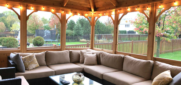 If you thought gazebos were only used at picturesque lakes, at wedding venues or in old-fashioned backyards; think again. Gazebos are no longer constrained by size or shape. Octagonal or hexagonal are just two shape options. Gazebos no longer need to be a very small ornamental space to stage pictures. Looking at the room above, you can see today’s gazebos are nothing like yesterday's. The pergola above not only fits a large sectional but also a couple of chairs, a coffee table, and an outdoor rug. It comes complete with electricity to wire in the string lights of your choice. One or more fans can be installed to ensure the entire outdoor room gets plenty of fresh air and a gentle breeze.