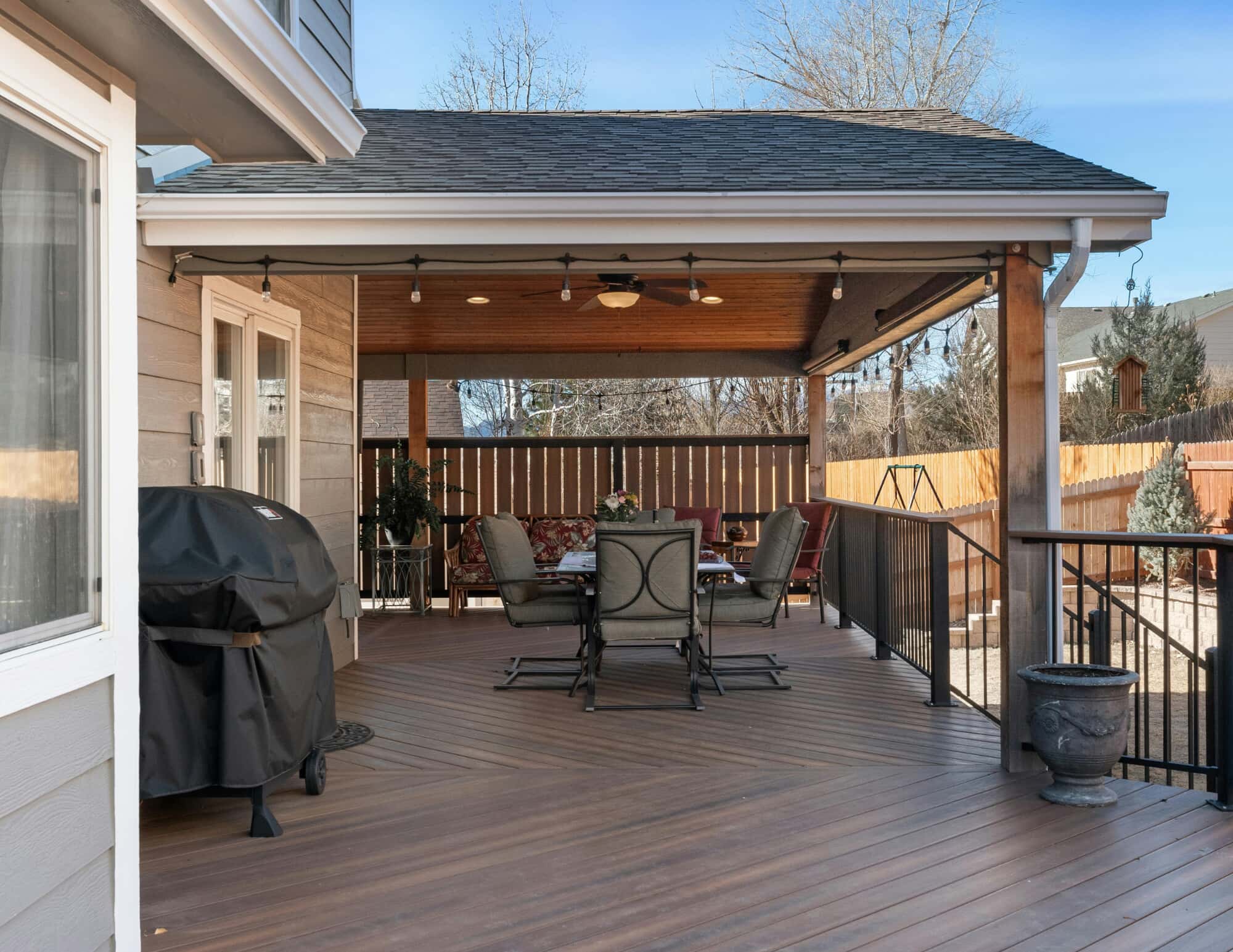 Why they work in Colorado Springs: The combination of elevation, afternoon rain, and intense sun means you need something structural, not decorative. An attached roof handles all three. It also creates the perfect base for ceiling fans, outdoor lighting, and even a mounted heater for shoulder-season use.
