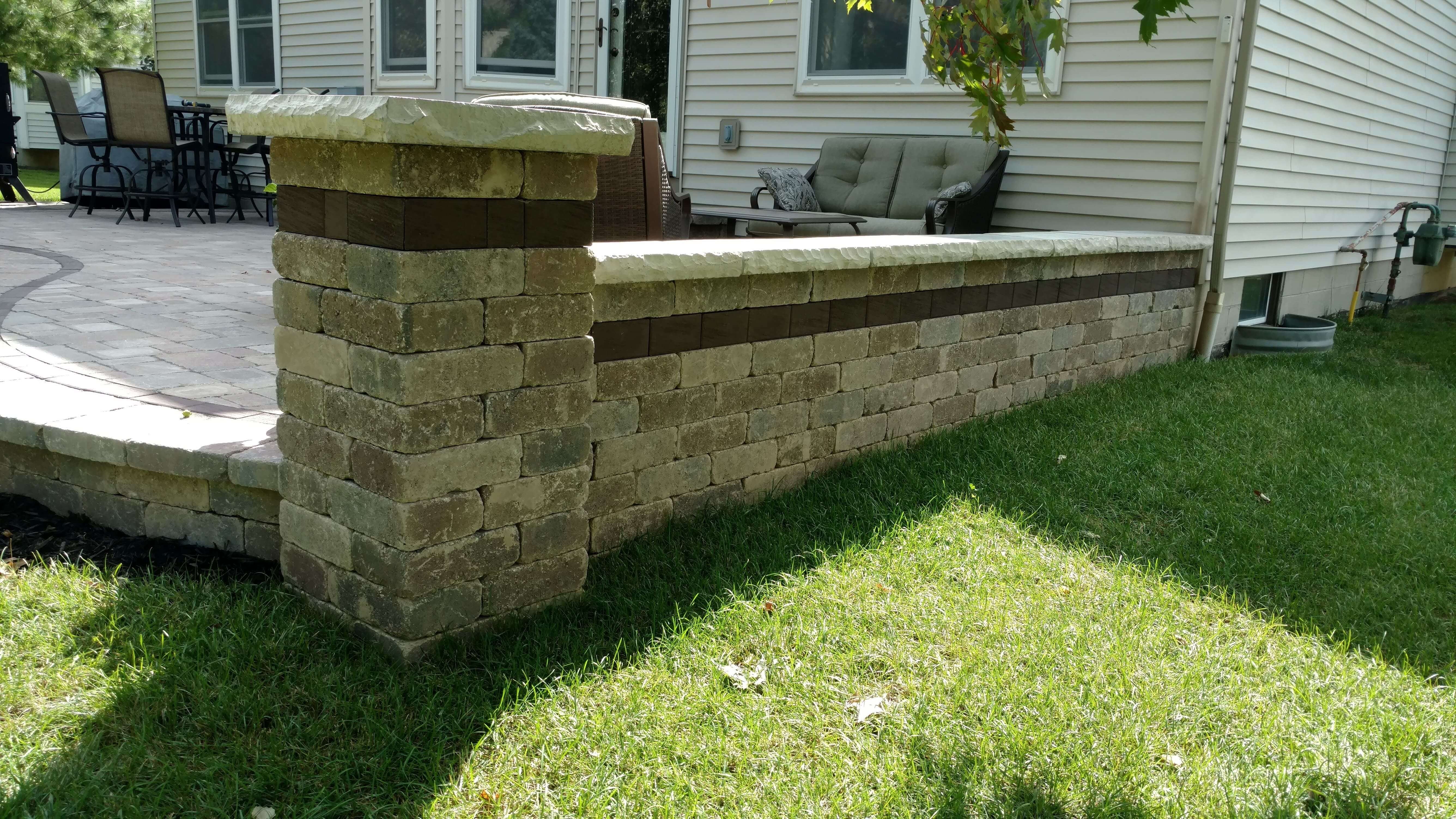 We used Unilock Stonehenge pavers on the field of the patio. For the privacy/retaining wall we used Unilock Brussels Dimensional stone and for the accent border we used Unilock Il Campo in Mocha. One of the unique aspects of this project was that instead of choosing the main field area paver for this project first, the homeowners chose the accent stone used in the border as the basis to choosing the remainder of the hardscapes. This concept worked out as all the colors and textures flow together perfectly.