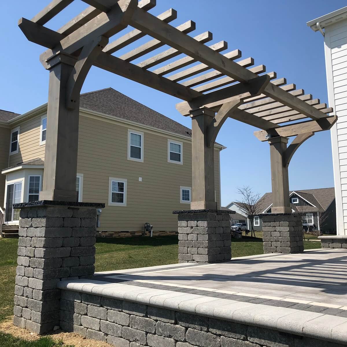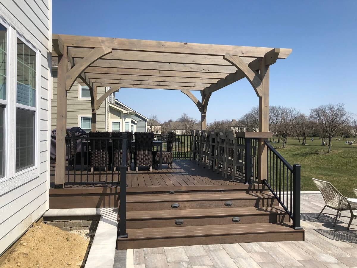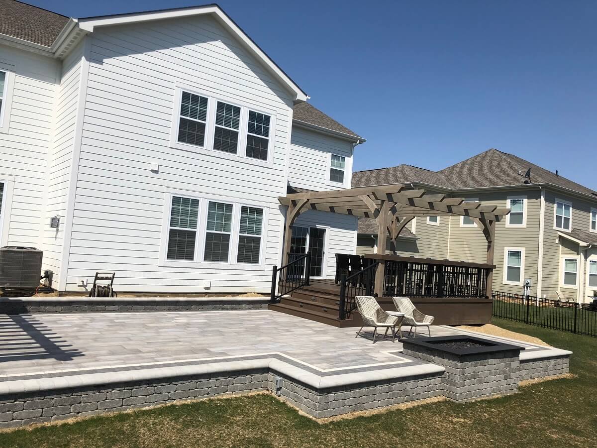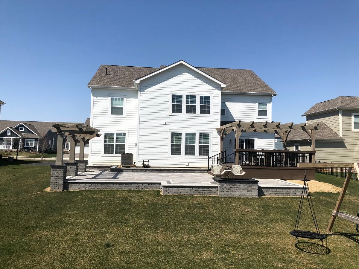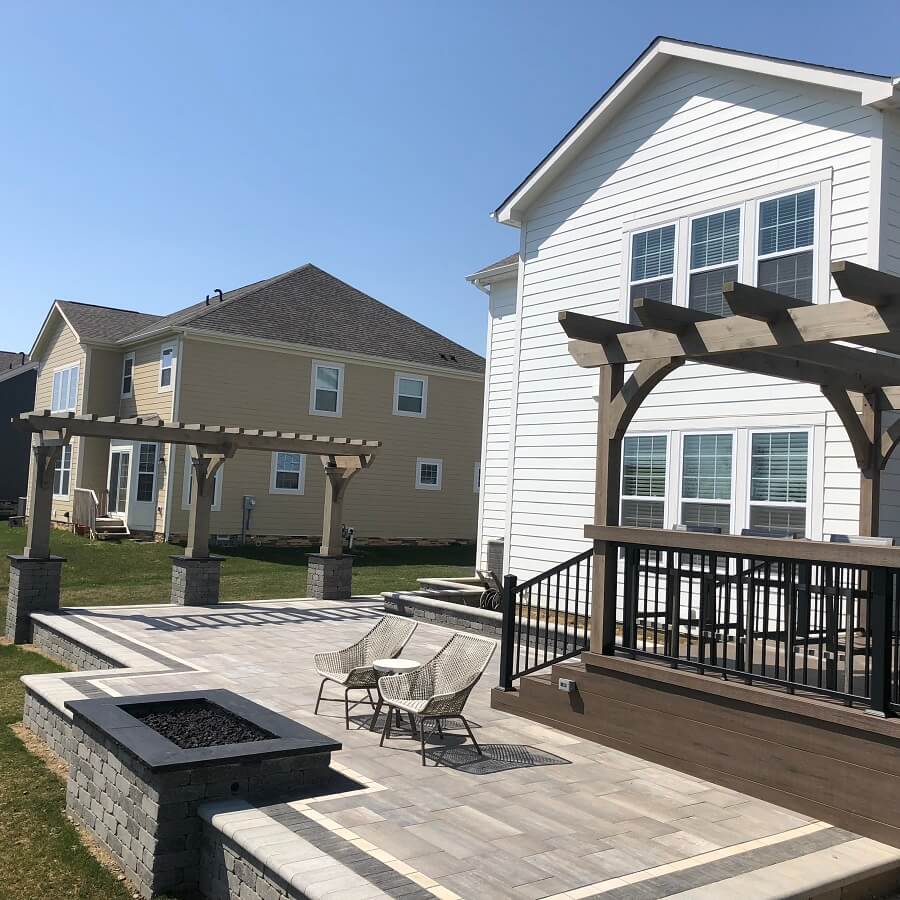 This stunning project, a combination hardscape, deck, pergola and fire pit project in the Ballantrae subdivision of Dublin, Ohio, is a work of art. This deluxe outdoor living space deserves an emphasis on the word deluxe. While Archadeck of Columbus can take credit for the execution, we can’t take credit for the materials selection. The homeowners devoted all of the time necessary to look at hundreds (maybe thousands) of pavers and stones and made their own selections for the hardscapes. Quite a few different materials went into this project, and yet it all comes together as a unified design in a splendid pattern of white, black and variable grays.