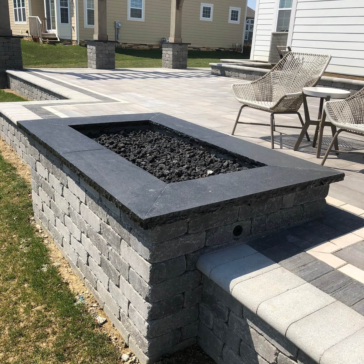 Near the house, the low retaining wall—which will serve as a planter—is made with Edington wall stone in the Quarry Stone Blend color, from Oberfields. The retaining wall is capped with the same Unilock bullnose cap that created the patio edge. The pillars are made with the same Edington wall stone, as is the base for the unique rectangular gas-burning fire pit. Finally, the pillars and the fire pit rim are topped with limestone from Banas Stones in their kota black color.