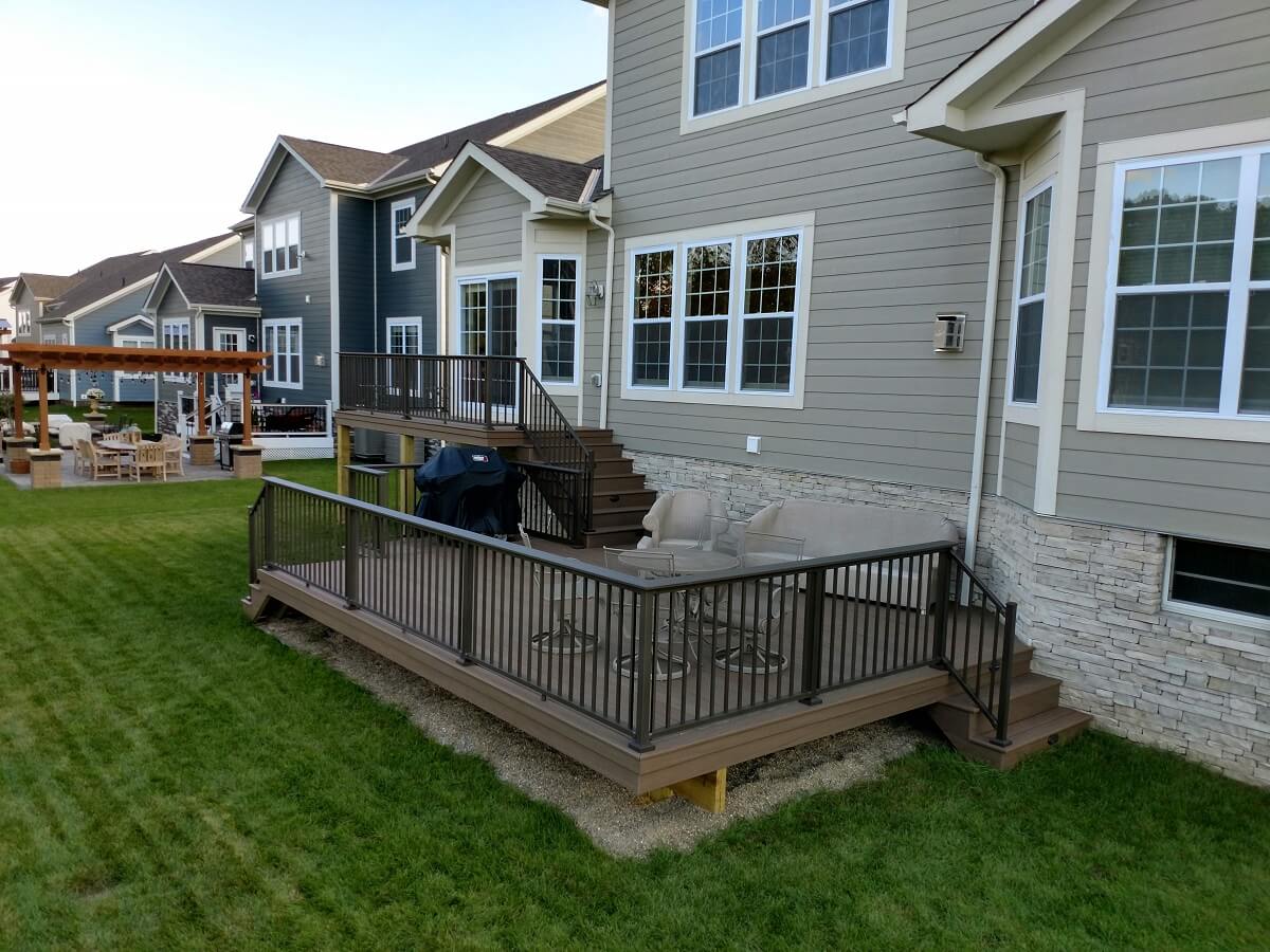 This gorgeous deck addition was built with low-maintenance TimberTech Legacy decking in the Pecan finish. The entire perimeter of the split level deck is finished with picture framing for a buttoned-up aesthetic. The Westbury bronze aluminum railings are the perfect complement to the pecan decking, and both the deck and railings are a great dark contrast to the home’s light siding, trim, and stone finishes. As you can see, the deck is spacious enough for seating, eating, and grilling…and that’s just on the lower level. Our original design for the upper level was to have it extend as far as the lower. However, the HOA required us to redact the upper level to adhere to their building specifications.