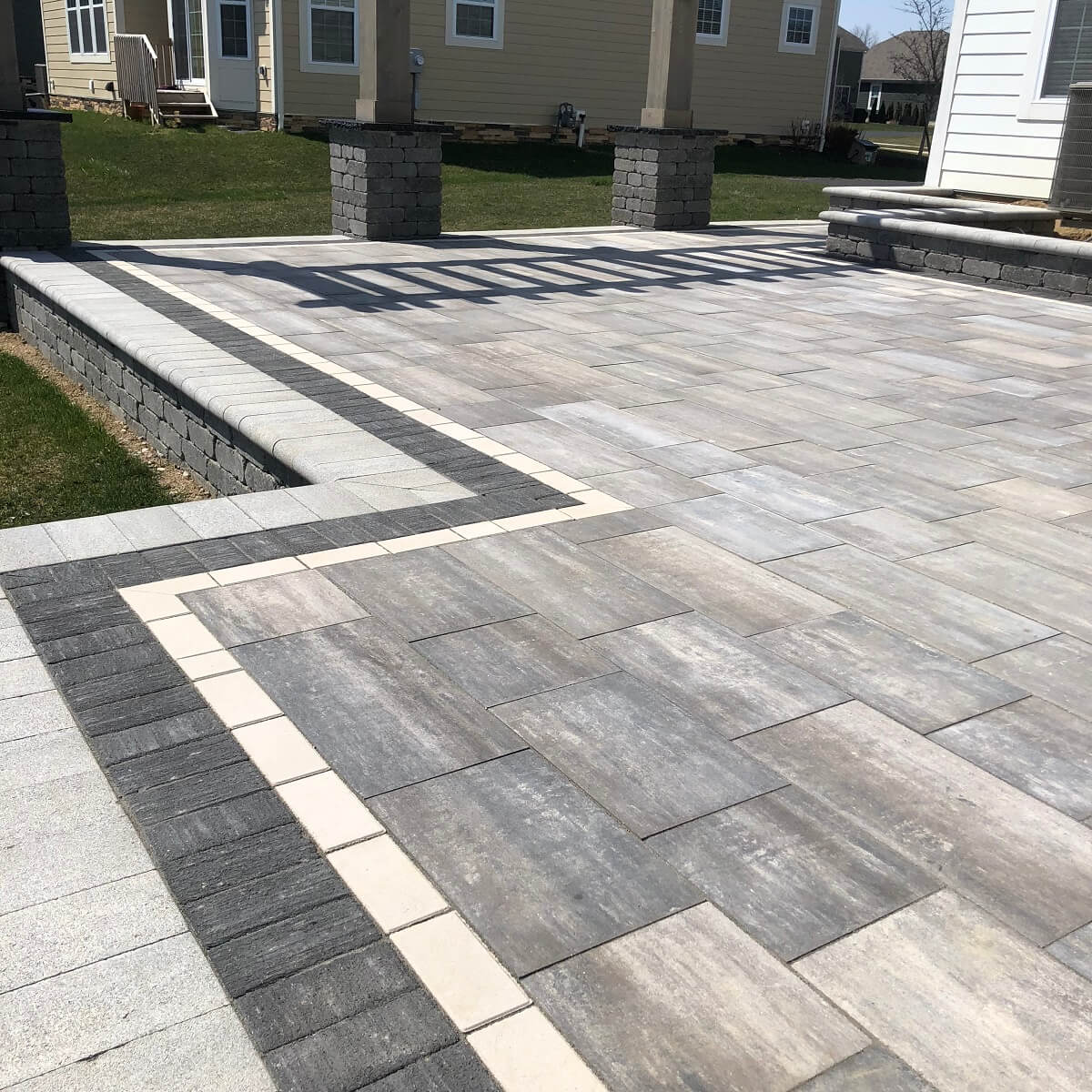 When you’re looking for patio ideas, you should consider the paver rug. In a paver rug design, we interrupt the design of a patio’s field to create an inset design with complementary or contrasting pavers. The possibilities are endless, and this is where you can personalize a patio to be uniquely yours. In the same way that a rug changes the design and texture of an area of a room’s floor/surface, so does a paver rug within a patio. Laying the paver rug in a different pattern defines the “rug” area and adds visual interest. A specific example of a paver rug would be an inset design of stain-resistant pavers in an outdoor kitchen, grilling or dining area—chosen for easy cleaning.