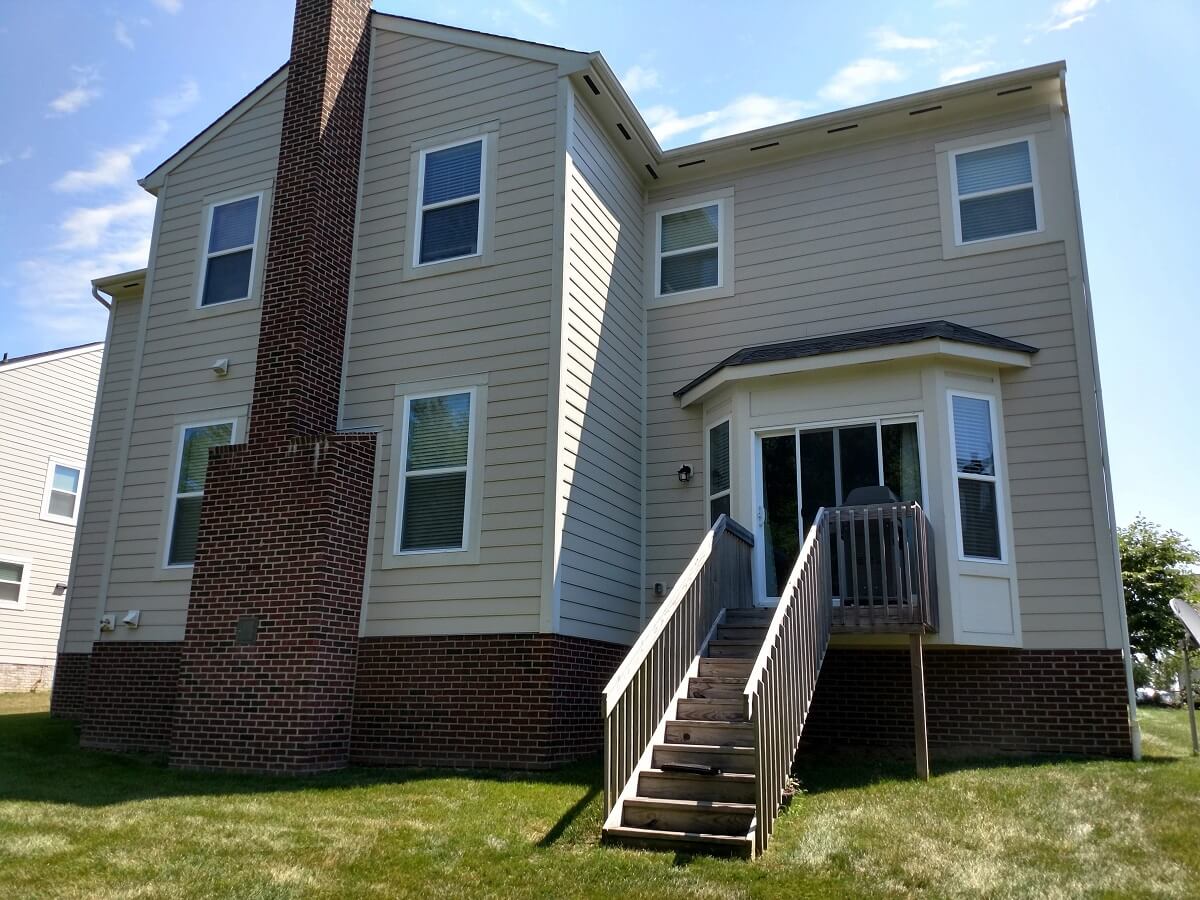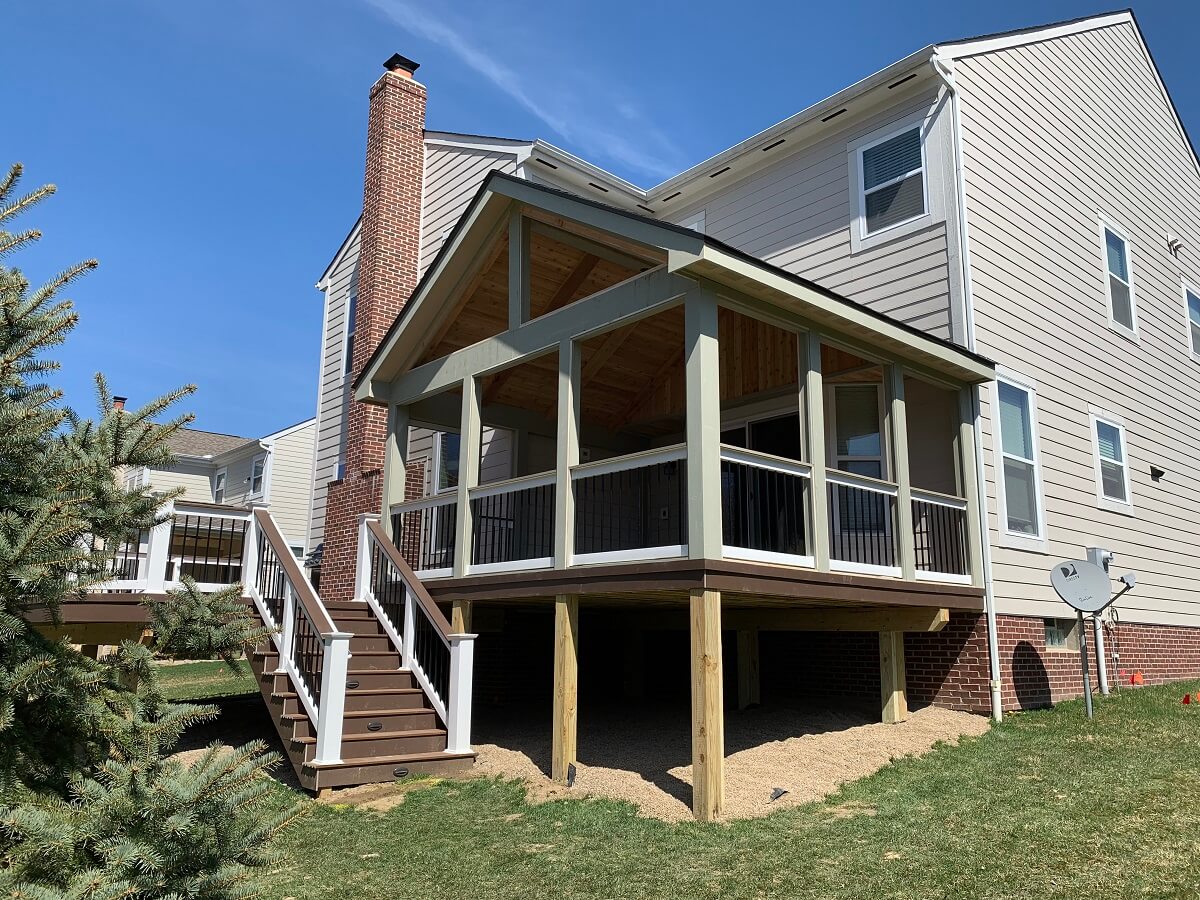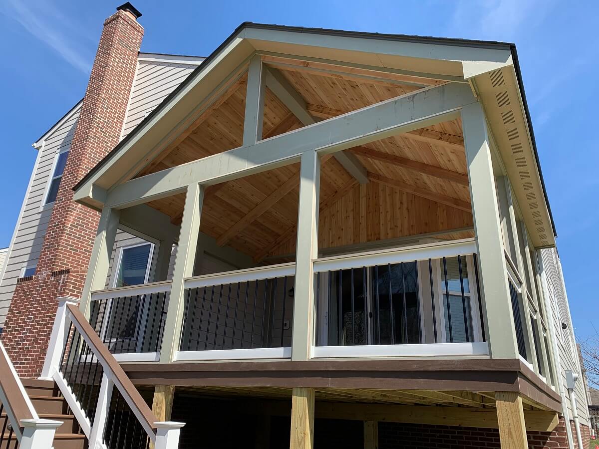 The homeowners wanted to add a deck and screened porch combination outdoor living space. Before deck and porch builder Archadeck of Columbus arrived on the scene, the clients had absolutely no outdoor living area in their back yard. Because the yard slopes downward from the house, they had a set of wooden stairs leading from the back entry down to the ground. That was the only structure in sight. The stairway featured such a tiny landing at the top, it provided no room for chairs, a table or a grill.