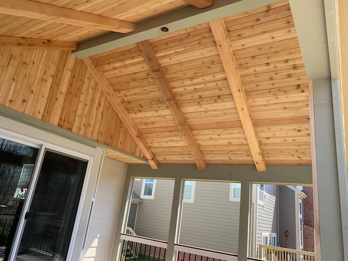 The original sliding glass doors were part of a bump-out design at the back of the home. While we didn’t change that aspect, we added a cedar tongue-and-groove wall over the bump-out to support the porch’s ridge beam. Carrying over the cedar tongue-and-groove aesthetic from the ceiling to the ridge support wall locks in the impression that this porch was original to the home.