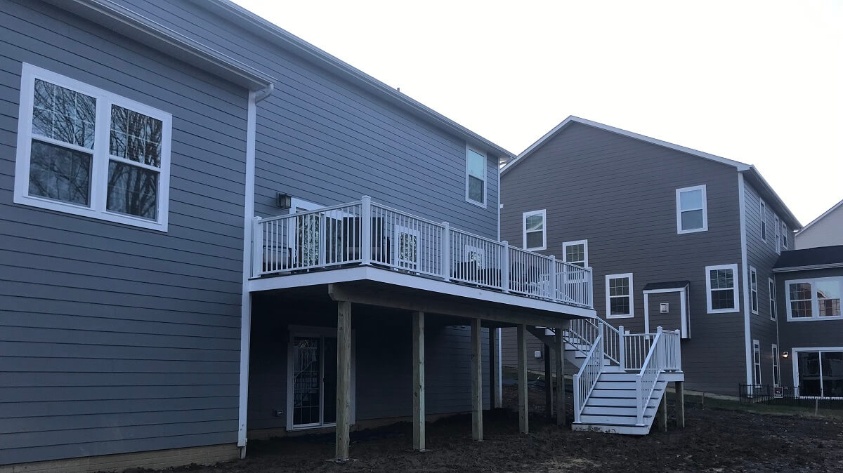 Adding to the low-maintenance value of the deck, are the beautiful, stark white aluminum powder-coated deck railings. We trimmed out the fascia of this deck with white Fypon PVC trim, matching the home’s windows and trim, as well as the deck railings.